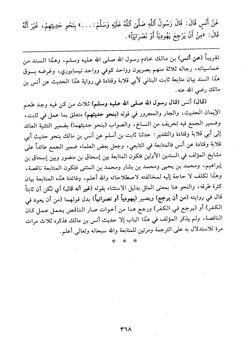(قال) أنس (قال رسول الله صلى الله عليه وسلم) ثلاث من كن فيه وجد طعم الإيمان الحديث، والجار والمجرور في قوله (بنحو حديثهم) متعلق بما عمل في ثابت، وضمير الجمع فيه تحريف من النساخ، والصواب (بنحو حديثهما) بضمير التثنية العائد إلى أبي قلابة وقتادة والتقدير: حدثنا ثابت بن أسلم عن أنس بن مالك بنحو حديث أبي قلابة وقتادة عن أنس فالمتابعة في التابعي، وجعل بعض العلماء ضمير الجمع عائدًا على مشايخ المؤلف في السندين الأولين فتكون المتابعة بين إسحاق بن منصور وبين إسحاق بن إبراهيم، ومحمد بن يحيى ومحمد بن بشار ومحمد بن المثنى فتكون المتابعة ناقصة، وهذا تكلف لا حاجة إليه لمخالفته لاصطلاحاته والله أعلم، وفائدة هذه المتابعة بيان كثرة طرقه، والنحو هنا بمعنى المثل بدليل الاستثناء بقوله (غير أنه قال) أي لكن أن ثابتًا قال في روايته (من أن يرجع) ويصير (يهوديًّا أو نصرانيًّا) بدل قولهما (من أن يعود في الكفر) أو (يرجع في الكفر) ورجع هنا من أخوات صار الناقص يعمل عمل كان الناقصة، ولم يذكر المؤلف في هذا الباب إلا حديث أنس بن مالك فذكره ثلاث مرات مرة للاستدلال به على الترجمة ومرتين للمتابعة والله سبحانه وتعالى أعلم.