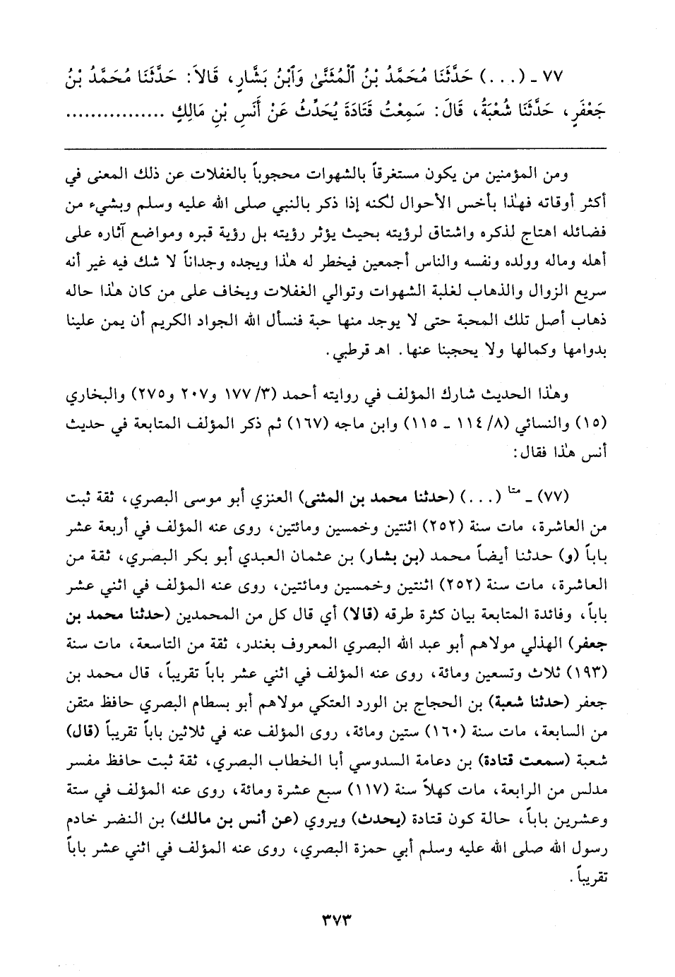 ٧٧ - (٠٠) حَدَّثَنَا مُحَمَّدُ بْنُ الْمُثَنَّى وَابْنُ بَشَّارٍ، قَالا: حَدَّثَنَا مُحَمَّدُ بْنُ جَعْفَرٍ، حَدَّثَنَا شُعْبَةُ، قَال: سَمِعْتُ قَتَادَةَ يُحَدِّثُ عَنْ أَنَسِ بْنِ مَالِكٍ