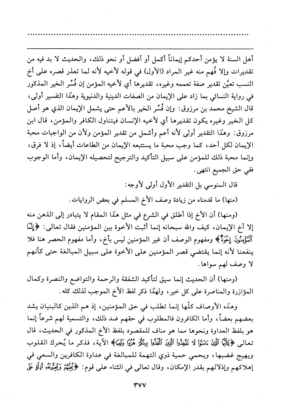 أهل السنة لا يؤمن أحدكم إيمانًا أكمل أو أفضل أو نحو ذلك، والحديث لا بد فيه من تقديرات وإلا فُهم منه غير المراد (الأول) في قوله لأخيه لأنه لما تعذر قصره على أخ النسب تعيَّن تقدير صفة تعممه وغيره، تقديرها أي لأخيه المؤمن إن فُسِّر الخير المذكور في رواية النسائي بما زاد على الإيمان من الصفات الدين ية والدنيوية وهذا التفسير أولى، قال الشيخ محمد بن مرزوق: وإن فُسِّر الخير بالأعم حتى يشمل الإيمان الذي هو أصل كل الخير وغيره يكون تقديرها أي لأخيه الإنسان فيتناول الكافر والمؤمن، قال ابن مرزوق: وهذا التقدير أولى لأنه أعم وأشمل من تقدير المؤمن ولأن من الواجبات محبة الإيمان لكل أحد، كما وجب محبة ما يستتبعه الإيمان من الطاعات أيضًا، إذ لا فرق، وإنما محبة ذلك للمؤمن على سبيل التأكيد والترجيح لتحصيله الإيمان، وأما الوجوب ففي حق الجميع انتهى.
