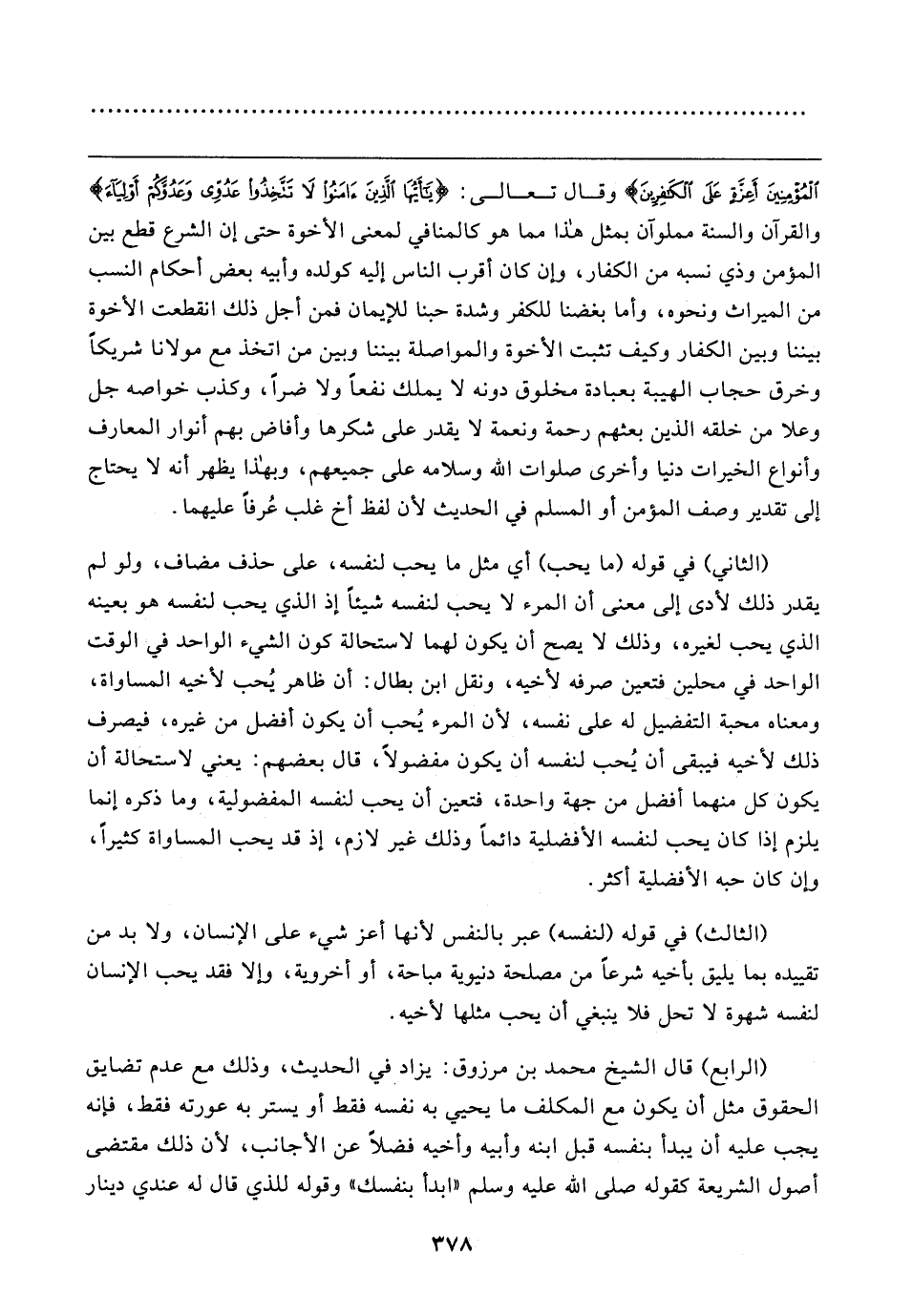 الْمُؤْمِنِينَ أَعِزَّةٍ عَلَى الْكَافِرِينَ} وقال تعالى: {يَا أَيُّهَا الَّذِينَ آمَنُوا لَا تَتَّخِذُوا عَدُوِّي وَعَدُوَّكُمْ أَوْلِيَاءَ} والقرآن والسنة مملوآن بمثل هذا مما هو كالمنافي لمعنى الأخوة حتى إن الشرع قطع بين المؤمن وذي نسبه من الكفار، وإن كان أقرب الناس إليه كولده وأبيه بعض أحكام النسب من الميراث ونحوه، وأما بغضنا للكفر وشدة حبنا للإيمان فمن أجل ذلك انقطعت الأخوة بيننا وبين الكفار وكيف تثبت الأخوة والمواصلة بيننا وبين من اتخذ مع مولانا شريكًا وخرق حجاب الهيبة بعبادة مخلوق دونه لا يملك نفعًا ولا ضرًّا، وكذب خواصه جل وعلا من خلقه الذين بعثهم رحمة ونعمة لا يقدر على شكرها وأفاض بهم أنوار المعارف وأنواع الخيرات دنيا وأخرى صلوات الله وسلامه على جميعهم، وبهذا يظهر أنه لا يحتاج إلى تقدير وصف المؤمن أو المسلم في الحديث لأن لفظ أخ غلب عُرفًا عليهما.