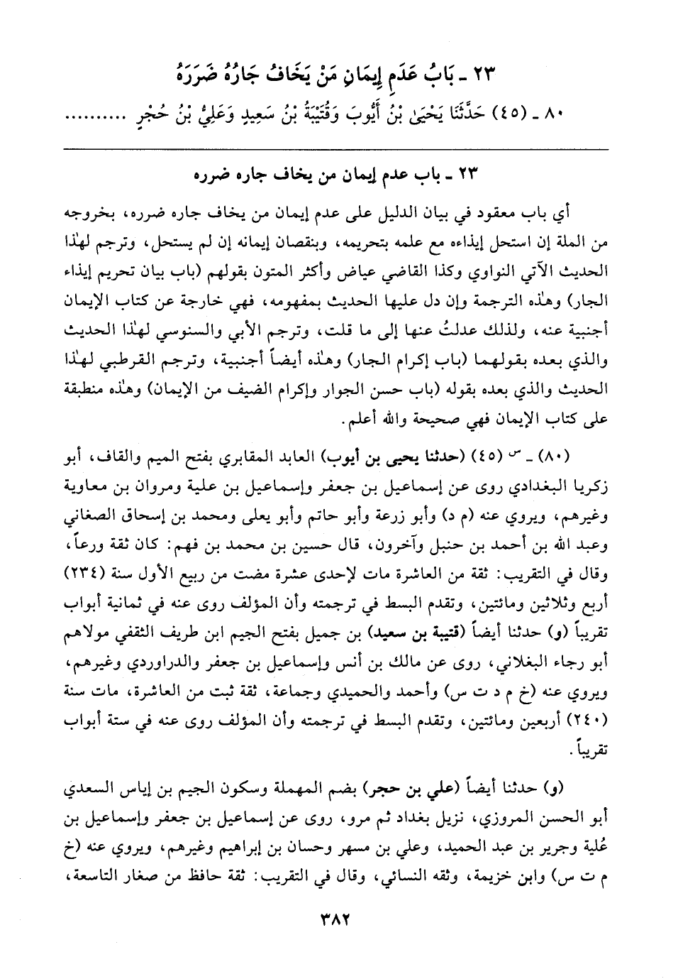 ٨٠ - (٤٥) حَدَّثَنَا يَحْيَى بْنُ أَيُّوبَ وَقُتَيبَةُ بْنُ سَعِيدٍ وَعَلِيُّ بْنُ حُجْرٍ