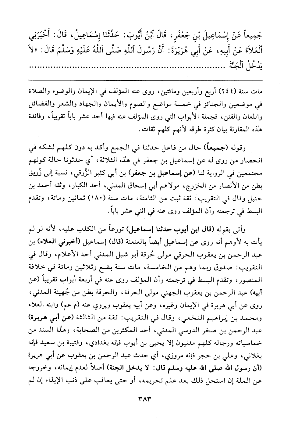 جَمِيعًا عَنْ إِسْمَاعِيلَ بْنِ جَعْفَرٍ، قَال ابْنُ أَيُّوبَ: حَدَّثَنَا إِسْمَاعِيلُ، قَال: أَخْبَرَنِي الْعَلاءُ عَنْ أَبِيهِ، عَنْ أَبِي هُرَيرَةَ: أَنَّ رَسُولَ اللهِ صَلَّى اللهُ عَلَيهِ وَسَلَّمَ قَال: "لَا يَدْخُلُ الْجَنَّةَ
