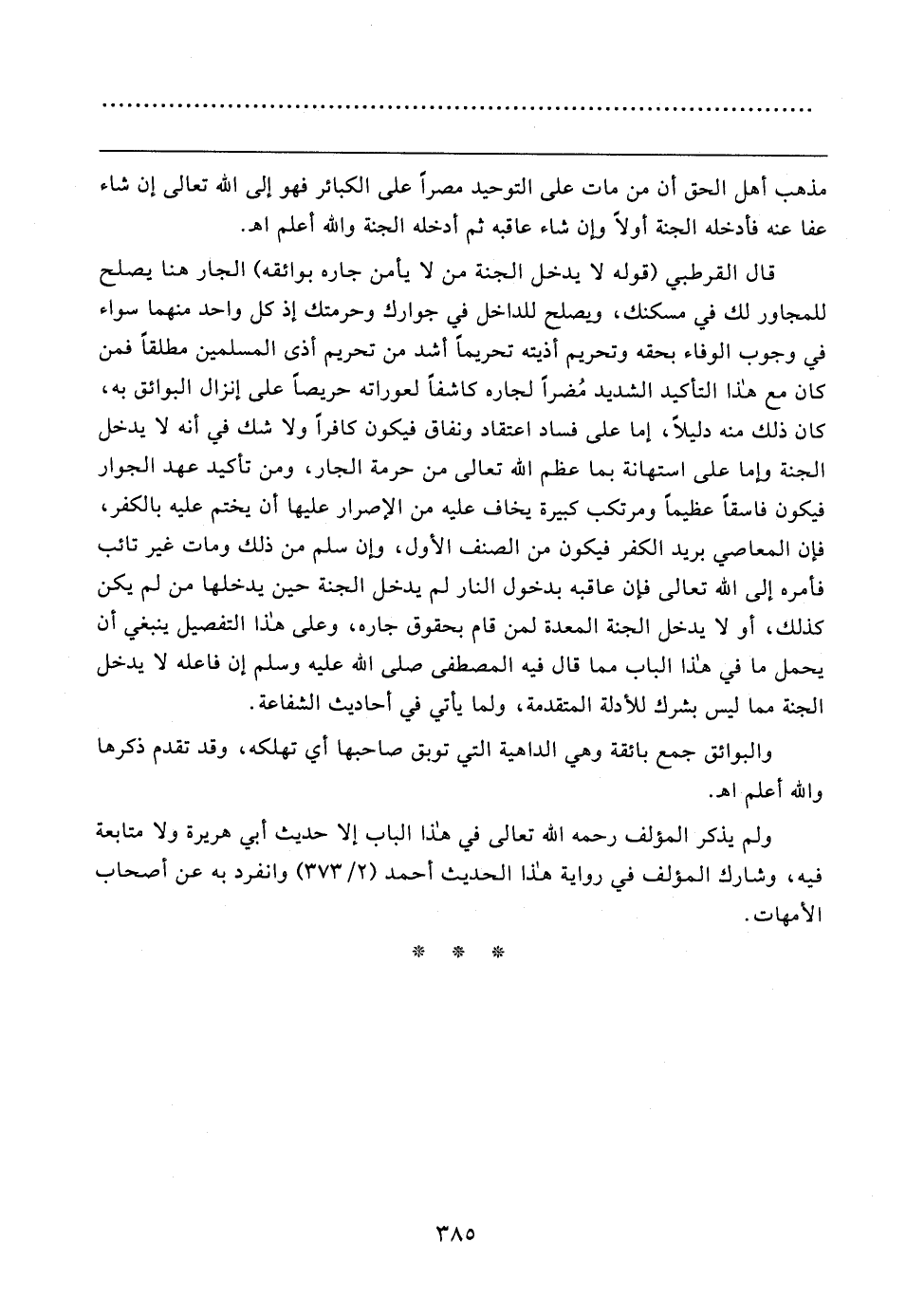 قال القرطبي (قوله لا يدخل الجنة من لا يأمن جاره بوائقه) الجار هنا يصلح للمجاور لك في مسكنك، ويصلح للداخل في جوارك وحرمتك إذ كل واحد منهما سواء في وجوب الوفاء بحقه وتحريم أذيته تحريمًا أشد من تحريم أذى المسلمين مطلقًا فمن كان مع هذا التأكيد الشديد مُضرًّا لجاره كاشفًا لعوراته حريصًا على إنزال البوائق به، كان ذلك منه دليلًا، إما على فساد اعتقاد ونفاق فيكون كافرًا ولا شك في أنه لا يدخل الجنة وإما على استهانة بما عظم الله تعالى من حرمة الجار، ومن تأكيد عهد الجوار فيكون فاسقًا عظيمًا ومرتكب كبيرة يخاف عليه من الإصرار عليها أن يختم عليه بالكفر، فإن المعاصي بريد الكفر فيكون من المصنف الأول، وإن سلم من ذلك ومات غير تائب فأمره إلى الله تعالى فإن عاقبه بدخول النار لم يدخل الجنة حين يدخلها من لم يكن كذلك، أو لا يدخل الجنة المعدة لمن قام بحقوق جاره، وعلى هذا التفصيل ينبغي أن يحمل ما في هذا الباب مما قال فيه المصطفى صلى الله عليه وسلم إن فاعله لا يدخل الجنة مما ليس بشرك للأدلة المتقدمة، ولما يأتي في أحاديث الشفاعة.