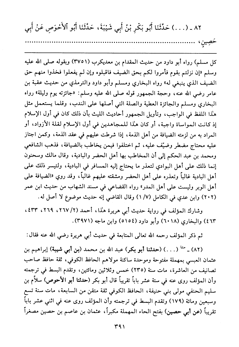 (٨٢) - متا (٠٠) (حدثنا أبو بكر) عبد الله بن محمد (بن أبي شيبة) إبراهيم بن عثمان العبسي بمهملة مفتوحة وموحدة ساكنة مولاهم الحافظ الكوفي، ثقة حافظ صاحب تصانيف من العاشرة، مات سنة (٢٣٥) خمس وثلاثين ومائتين، وتقدم البسط في ترجمته وأن المؤلف روى عنه في ستة عشر بابًا تقريبًا قال أبو بكر (حدثنا أبو الأحوص) سلَّام بن سليم الحنفي مولى بني حنيفة، الحافظ الكوفي ثقة متقن من السابعة، مات سنة تسع وسبعين ومائة (١٧٩) وتقدم البسط في ترجمته وأن المؤلف روى عنه في اثني عشر بابا تقريبًا (عن أبي حصين) بفتح الحاء المهملة مكبرًا، عثمان بن عاصم بن حصين مصغرًا