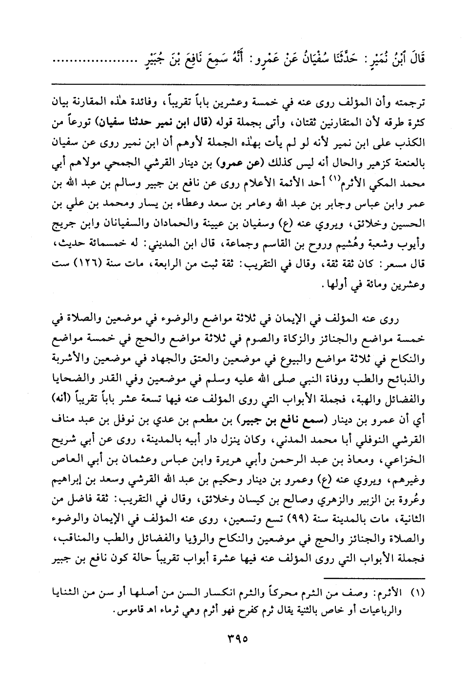 ترجمته وأن المؤلف روى عنه في خمسة وعشرين بابًا تقريبًا، وفائدة هذه المقارنة بيان كثرة طرقه لأن المتقارنين ثقتان، وأتى بجملة قوله (قال ابن نمير حدثنا سفيان) تورعًا من الكذب على ابن نمير لأنه لو لم يأت بهذه الجملة لأوهم أن ابن نمير روى عن سفيان بالعنعنة كزهير والحال أنه ليس كذلك (عن عمرو) بن دينار القرشي الجمحي مولاهم أبي محمد المكي الأثرم (١) أحد الأئمة الأعلام روى عن نافع بن جبير وسالم بن عبد الله بن عمر وابن عباس وجابر بن عبد الله وعامر بن سعد وعطاء بن يسار ومحمد بن علي بن الحسين وخلائق، ويروي عنه (ع) وسفيان بن عيينة والحمادان والسفيانان وابن جريج وأيوب وشعبة وهُشيم وروح بن القاسم وجماعة، قال ابن المديني: له خمسمائة حديث، قال مسعر: كان ثقة ثقة، وقال في التقريب: ثقة ثبت من الرابعة، مات سنة (١٢٦) ست وعشرين ومائة في أولها.