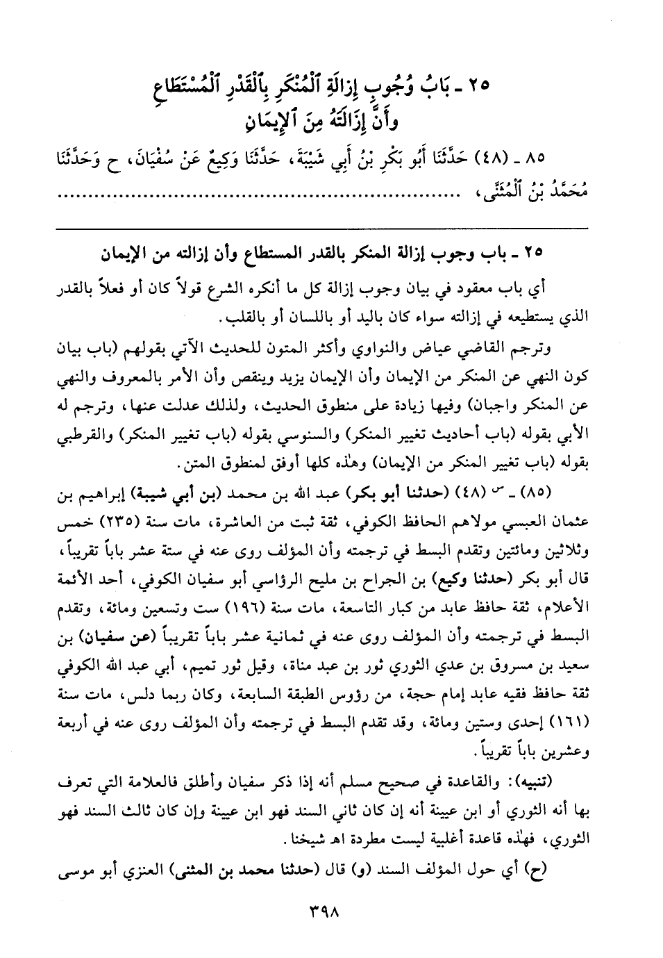 وترجم القاضي عياض والنواوي وأكثر المتون للحديث الآتي بقولهم (باب بيان كون النهي عن المنكر من الإيمان وأن الإيمان يزيد وينقص وأن الأمر بالمعروف والنهي عن المنكر واجبان) وفيها زيادة على منطوق الحديث، ولذلك عدلت عنها، وترجم له الأبي بقوله (باب أحاديث تغيير المنكر) والسنوسي بقوله (باب تغيير المنكر) والقرطبي بقوله (باب تغيير المنكر من الإيمان) وهذه كلها أوفق لمنطوق المتن.