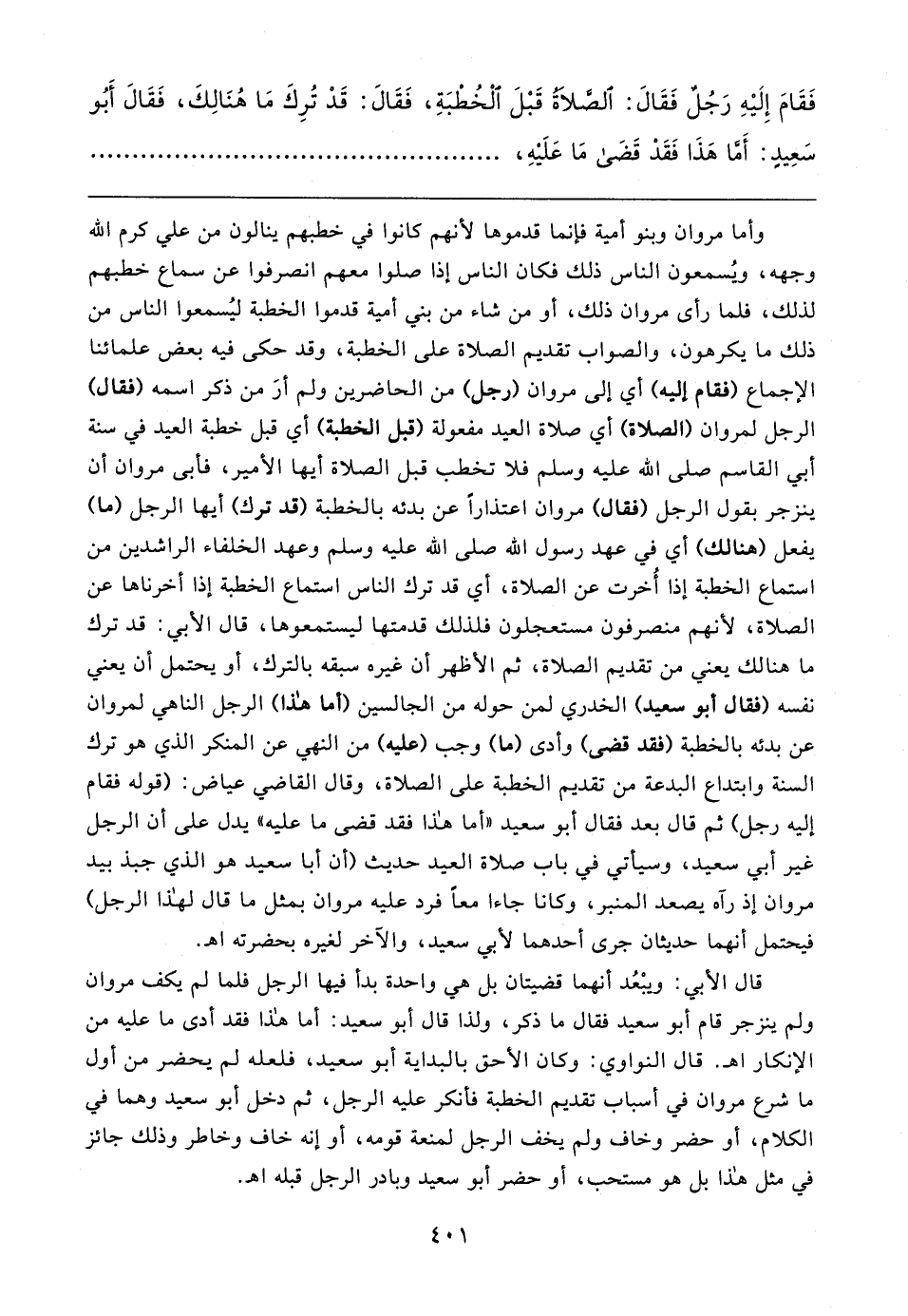 قال الأبي: ويبْعُد أنهما قضيتان بل هي واحدة بدأ فيها الرجل فلما لم يكف مروان ولم ينزجر قام أبو سعيد فقال ما ذكر، ولذا قال أبو سعيد: أما هذا فقد أدى ما عليه من الإنكار اهـ. قال النواوي: وكان الأحق بالبداية أبو سعيد، فلعله لم يحضر من أول ما شرع مروان في أسباب تقديم الخطبة فأنكر عليه الرجل، ثم دخل أبو سعيد وهما في الكلام، أو حضر وخاف ولم يخف الرجل لمنعة قومه، أو إنه خاف وخاطر وذلك جائز في مثل هذا بل هو مستحب، أو حضر أبو سعيد وبادر الرجل قبله اهـ.