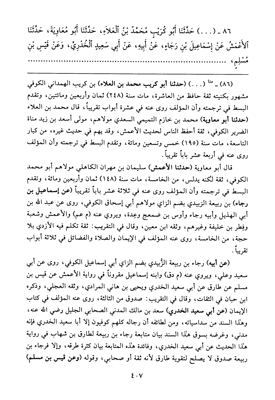 (٨٦) - متا (٠٠) (حدثنا أبو كريب محمد بن العلاء) بن كريب الهمداني الكوفي مشهور بكنيته ثقة حافظ من العاشرة، مات سنة (٢٤٨) ثمان وأربعين ومائتين، وتقدم البسط في ترجمته وأن المؤلف روى عنه في عشرة أبواب تقريبًا، قال محمد بن العلاء (حدثنا أبو معاوية) محمد بن خازم التميمي السعدي مولاهم، مولى أسعد بن زيد مناة الضرير الكوفي، ثقة أحفظ الناس لحديث الأعمش، وقد يهم في حديث غيره، من كبار التاسعة، مات سنة (١٩٥) خمس وتسعين ومائة، وتقدم البسط في ترجمته وأن المؤلف روى عنه في أربعة عشر بابًا تقريبًا.