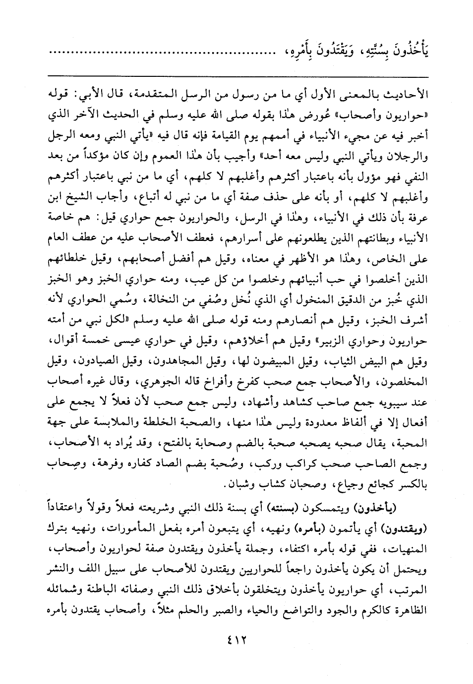 (يأخذون) ويتمسكون (بسنته) أي بسنة ذلك النبي وشريعته فعلًا وقولًا واعتقادًا (ويقتدون) أي يأتمون (بأمره) ونهيه، أي يتبعون أمره بفعل المأمورات، ونهيه بترك المنهيات، ففي قوله بأمره اكتفاء، وجملة يأخذون ويقتدون صفة لحواريون وأصحاب، ويحتمل أن يكون يأخذون راجعًا للحواريين ويقتدون للأصحاب على سبيل اللف والنشر المرتب، أي حواريون يأخذون ويتخلقون بأخلاق ذلك النبي وصفاته الباطنة وشمائله الظاهرة كالكرم والجود والتواضع والحياء والصبر والحلم مثلًا، وأصحاب يقتدون بأمره