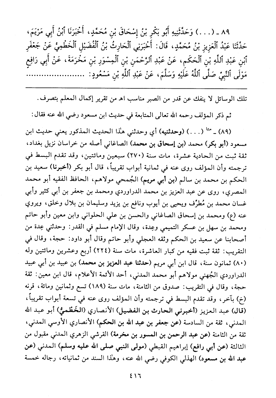ثم ذكر المؤلف رحمه الله تعالى المتابعة في حديث ابن مسعود رضي الله عنه فقال: (٨٩) - متا (٠٠) (وحدثنيه) أي وحدثني هذا الحديث المذكور يعني حديث ابن مسعود (أبو بكر) محمد (بن إسحاق بن محمد) الصاغاني أصله من خراسان نزيل بغداد، ثقة ثبت من الحادية عشرة، مات سنة (٢٧٠) سبعين ومائتين، وقد تقدم البسط في ترجمته وأن المؤلف روى عنه في ثمانية أبواب تقريبًا، قال أبو بكر (أخبرنا) سعيد بن الحكم بن محمد بن سالم (بن أبي مريم) الجُمحي مولاهم، الحافظ الفقيه أبو محمد المصري، روى عن عبد العزيز بن محمد الدراوردي ومحمد بن جعفر بن أبي كثير وأبي غسان محمد بن مُطرِّف ويحيى بن أيوب ونافع بن يزيد وسليمان بن بلال وخلق، ويروي عنه (ع) ومحمد بن إسحاق الصاغاني والحسن بن علي الحلواني وابن معين وأبو حاتم ومحمد بن سهل بن عسكر التميمي وعِدة، وقال الإمام مسلم في القدر: وحدثني عِدة من أصحابنا عن سعيد بن الحكم وثقه العجلي وأبو حاتم وقال أبو داود: حجة، وقال في التقريب: ثقة ثبت فقيه من كبار العاشرة، مات سنة (٢٢٤) أربع وعشرين ومائتين وله (٨٠) ثمانون سنة، قال ابن أبي مريم (حدثنا عبد العزيز بن محمد) بن عبيد بن أبي عبيد الدراوردي الجُهني مولاهم أبو محمد المدني، أحد الأئمة الأعلام، قال ابن معين: ثقة حجة، وقال في التقريب: صدوق من الثامنة، مات سنة (١٨٩) تسع وثمانين ومائة، قرنه (خ) بآخر، وقد تقدم البسط في ترجمته وأن المؤلف روى عنه في تسعة أبواب تقريبًا، (قال) عبد العزيز (أخبرني الحارث بن الفضيل) الأنصاري (الخَطْميُّ) أبو عبد الله المدني، ثقة من السادسة (عن جعفر بن عبد الله بن الحكم) الأنصاري الأوسي المدني، ثقة من الثامنة (عن عبد الرحمن بن المسور بن مخرمة) القرشي الزهري المدني مقبول من الثالثة (عن أبي رافع) إبراهيم القبطي (مولى النبي صلى الله عليه وسلم) المدني (عن عبد الله بن مسعود) الهذلي الكوفي رضي الله عنه، وهذا السند من ثمانياته، رجاله خمسة