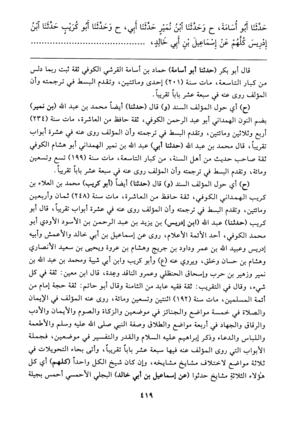 قال أبو بكر (حدثنا أبو أسامة) حماد بن أسامة القرشي الكوفي ثقة ثبت ربما دلس من كبار التاسعة، مات سنة (٢٠١) إحدى ومائتين، وتقدم البسط في ترجمته وأن المؤلف روى عنه في سبعة عشر بابًا تقريبًا.