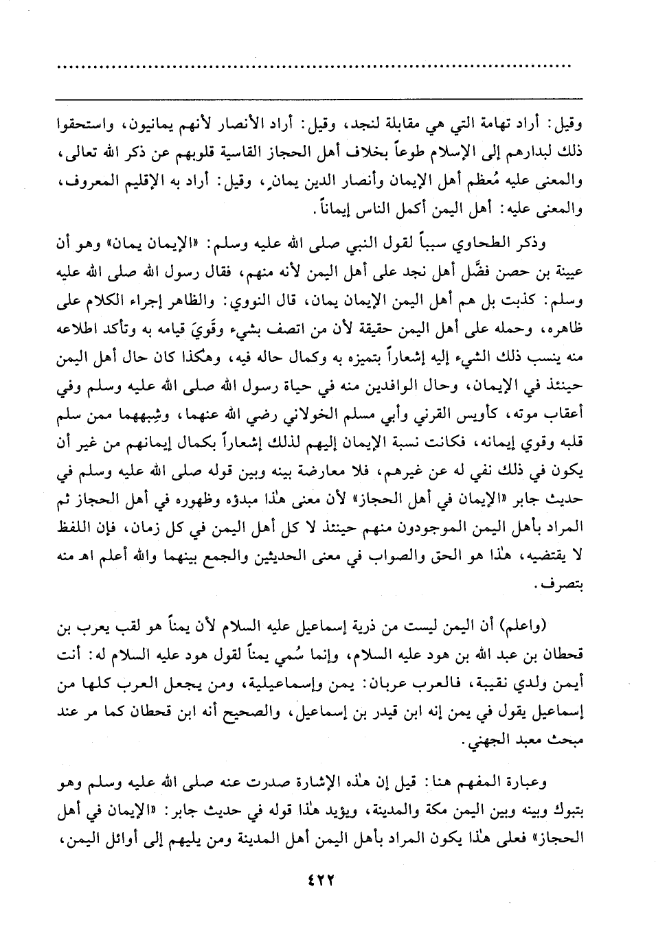 وذكر الطحاوي سببًا لقول النبي صلى الله عليه وسلم: "الإيمان يمان" وهو أن عيينة بن حصن فضَّل أهل نجد على أهل اليمن لأنه منهم، فقال رسول الله صلى الله عليه وسلم: كذبت بل هم أهل اليمن الإيمان يمان، قال النووي: والظاهر إجراء الكلام على ظاهره، وحمله على أهل اليمن حقيقة لأن من اتصف بشيء وقَويَ قيامه به وتأكد اطلاعه منه ينسب ذلك الشيء إليه إشعارًا بتميزه به وكمال حاله فيه، وهكذا كان حال أهل اليمن حينئذ في الإيمان، وحال الوافدين منه في حياة رسول الله صلى الله عليه وسلم وفي أعقاب موته، كأويس القرني وأبي مسلم الخولاني رضي الله عنهما، وشِبههما ممن سلم قلبه وقوي إيمانه، فكانت نسبة الإيمان إليهم لذلك إشعارًا بكمال إيمانهم من غير أن يكون في ذلك نفي له عن غيرهم، فلا معارضة بينه وبين قوله صلى الله عليه وسلم في حديث جابر "الإيمان في أهل الحجاز" لأن معنى هذا مبدؤه وظهوره في أهل الحجاز ثم المراد بأهل اليمن الموجودون منهم حينئذ لا كل أهل اليمن في كل زمان، فإن اللفظ لا يقتضيه، هذا هو الحق والصواب في معنى الحديثين والجمع بينهما والله أعلم اهـ منه بتصرف.