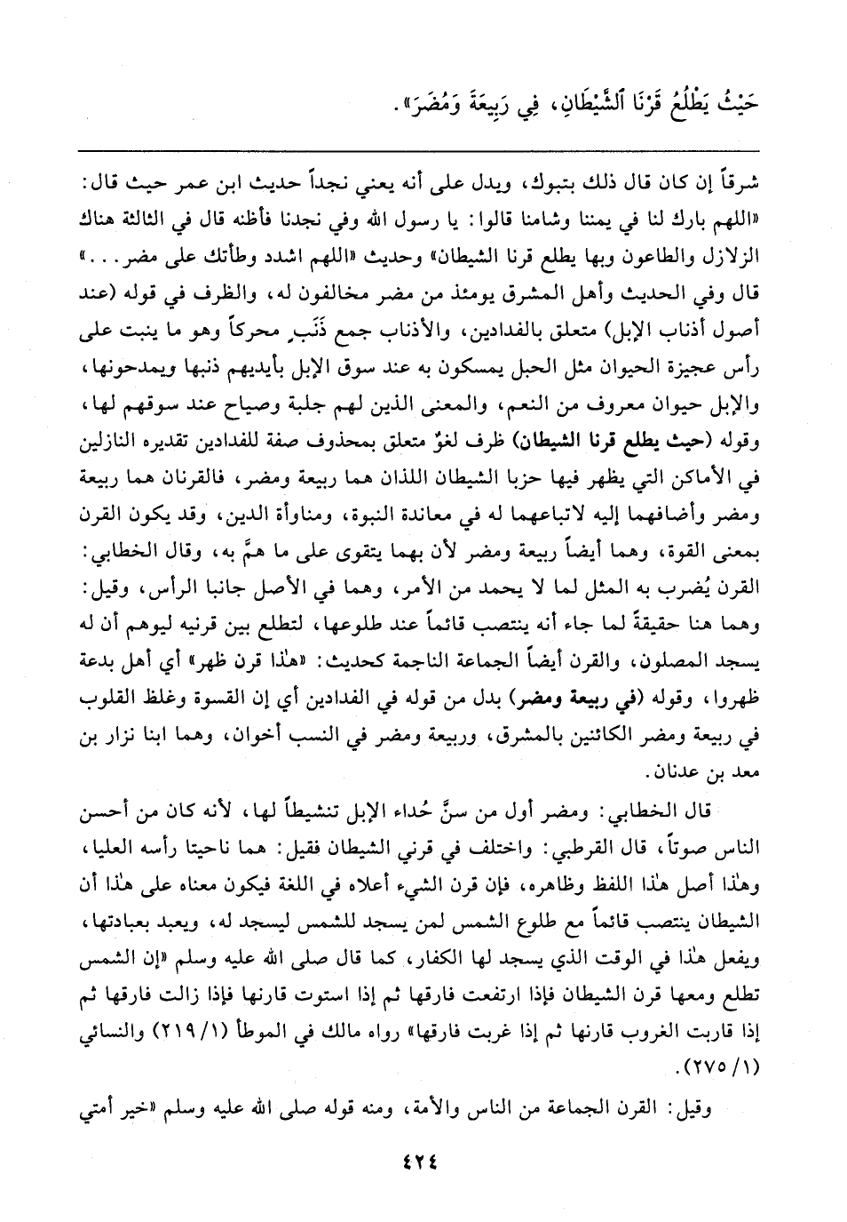 قال الخطابي: ومضر أول من سنَّ حُداء الإبل تنشيطًا لها، لأنه كان من أحسن الناس صوتًا، قال القرطبي: واختلف في قرني الشيطان فقيل: هما ناحيتا رأسه العليا، وهذا أصل هذا اللفظ وظاهره، فإن قرن الشيء أعلاه في اللغة فيكون معناه على هذا أن الشيطان ينتصب قائمًا مع طلوع الشمس لمن يسجد للشمس ليسجد له، ويعبد بعبادتها، ويفعل هذا في الوقت الذي يسجد لها الكفار، كما قال صلى الله عليه وسلم "إن الشمس تطلع ومعها قرن الشيطان فإذا ارتفعت فارقها ثم إذا استوت قارنها فإذا زالت فارقها ثم إذا قاربت الغروب قارنها ثم إذا غربت فارقها" رواه مالك في الموطأ (١/ ٢١٩) والنسائي (١/ ٢٧٥).