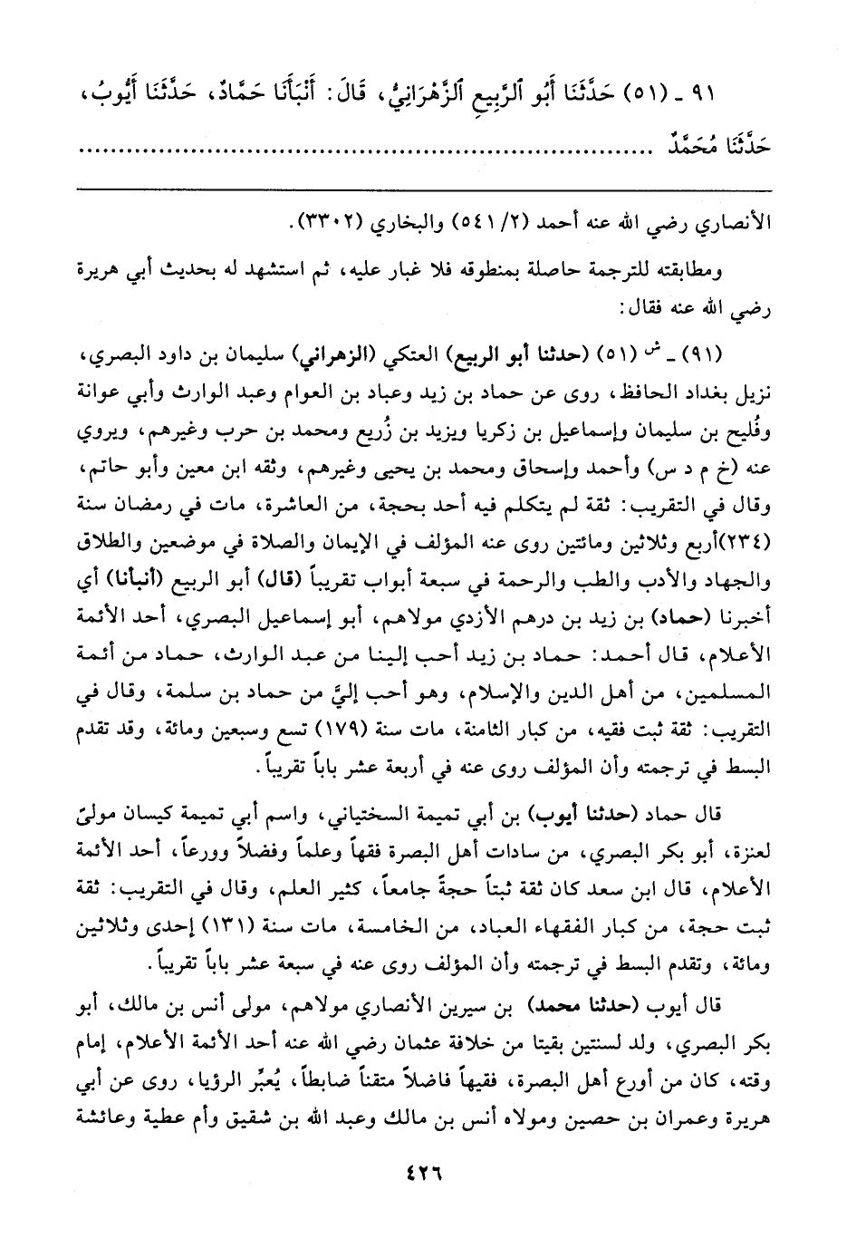 ٩١ - (٥١) حَدَّثَنَا أَبُو الرَّبِيعِ الزَّهْرَانِيُّ، قَال: أَنْبَأَنَا حَمَّادٌ، حَدَّثَنَا أَيُّوبُ، حَدَّثَنَا مُحَمَّدٌ