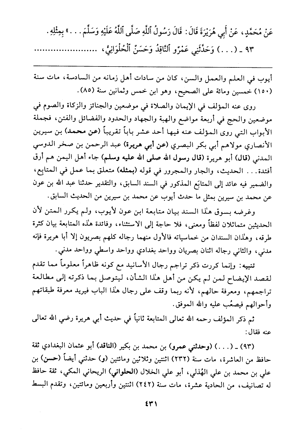 (٩٣) (٠٠) (وحدثني عمرو) بن محمد بن بكير (الناقد) أبو عثمان البغدادي ثقة حافظ من العاشرة، مات سنة (٢٣٢) اثنتين وثلاثين ومائتين (و) حدثني أيضًا (حسن) بن علي بن محمد بن علي الهُذلي، أبو علي الخلال (الحلواني) الريحاني المكي، ثقة حافظ له تصانيف، من الحادية عشرة، مات سنة (٢٤٢) اثنتين وأربعين ومائتين، وتقدم البسط
