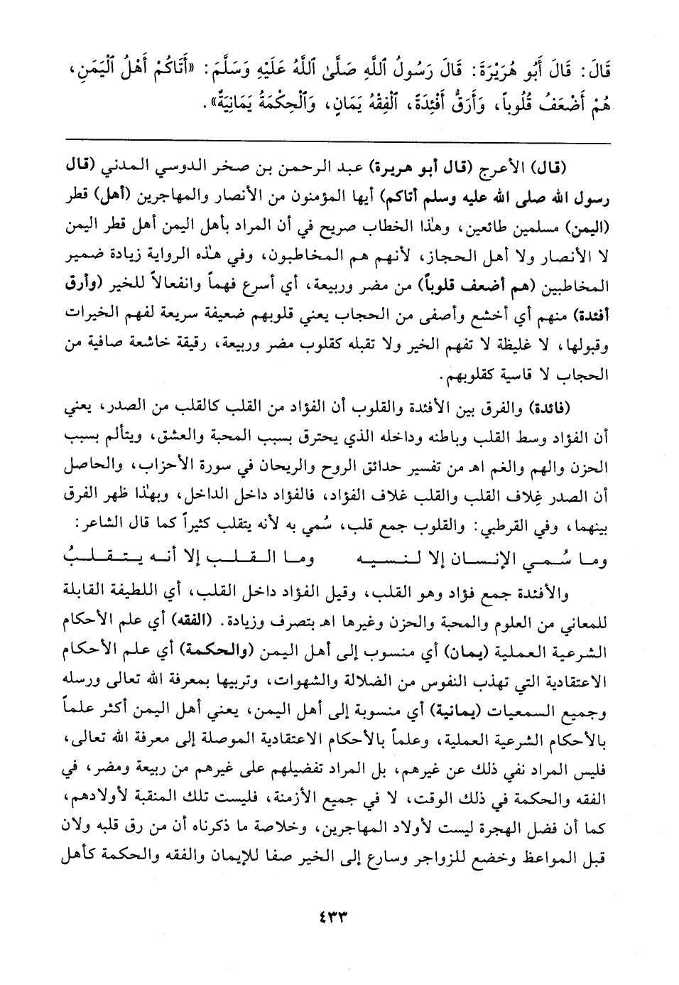 والأفئدة جمع فؤاد وهو القلب، وقيل الفؤاد داخل القلب، أي اللطيفة القابلة للمعاني من العلوم والمحبة والحزن وغيرها اهـ بتصرف وزيادة. (الفقه) أي علم الأحكام الشرعية العملية (يمان) أي منسوب إلى أهل اليمن (والحكمة) أي علم الأحكام الاعتقادية التي تهذب النفوس من الضلالة والشهوات، وتربيها بمعرفة الله تعالى ورسله وجميع السمعيات (يمانية) أي منسوبة إلى أهل اليمن، يعني أهل اليمن أكثر علمًا بالأحكام الشرعية العملية، وعلمًا بالأحكام الاعتقادية الموصلة إلى معرفة الله تعالى، فليس المراد نفي ذلك عن غيرهم، بل المراد تفضيلهم على غيرهم من ربيعة ومضر، في الفقه والحكمة في ذلك الوقت، لا في جميع الأزمنة، فليست تلك المنقبة لأولادهم، كما أن فضل الهجرة ليست لأولاد المهاجرين، وخلاصة ما ذكرناه أن من رق قلبه ولان قبل المواعظ وخضع للزواجر وسارع إلى الخير صفا للإيمان والفقه والحكمة كأهل