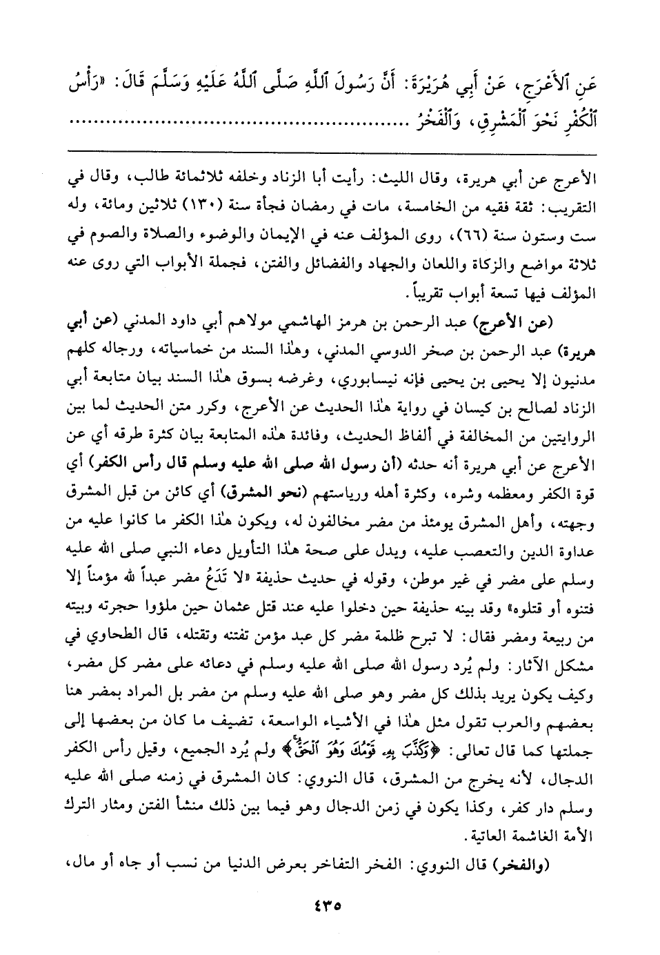 عَنِ الأعرَجِ، عَنْ أَبِي هُرَيرَةَ: أَنَّ رَسُولَ اللهِ صَلَّى اللهُ عَلَيهِ وَسَلَّمَ قَال: "رَأْسُ الْكُفْرِ نَحْوَ الْمَشْرِقِ، وَالْفَخْرُ