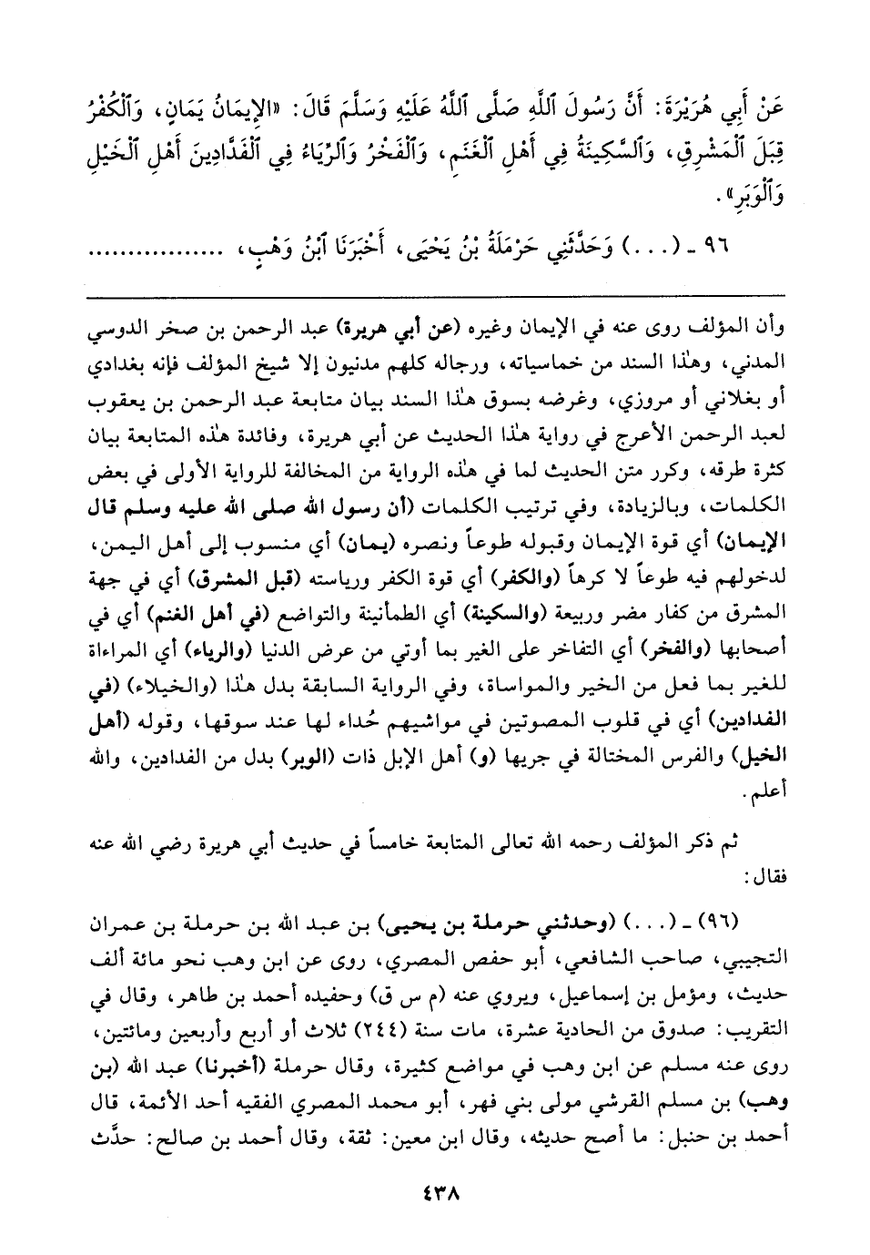 (٩٦) - (٠٠) (وحدثني حرملة بن يحيى) بن عبد الله بن حرملة بن عمران التجيبي، صاحب الشافعي، أبو حفص المصري، روى عن ابن وهب نحو مائة ألف حديث، ومؤمل بن إسماعيل، ويروي عنه (م س ق) وحفيده أحمد بن طاهر، وقال في التقريب: صدوق من الحادية عشرة، مات سنة (٢٤٤) ثلاث أو أربع وأربعين ومائتين، روى عنه مسلم عن ابن وهب في مواضع كثيرة، وقال حرملة (أخبرنا) عبد الله (بن وهب) بن مسلم القرشي مولى بني فهر، أبو محمد المصري الفقيه أحد الأئمة، قال أحمد بن حنبل: ما أصح حديثه، وقال ابن معين: ثقة، وقال أحمد بن صالح: حدَّث