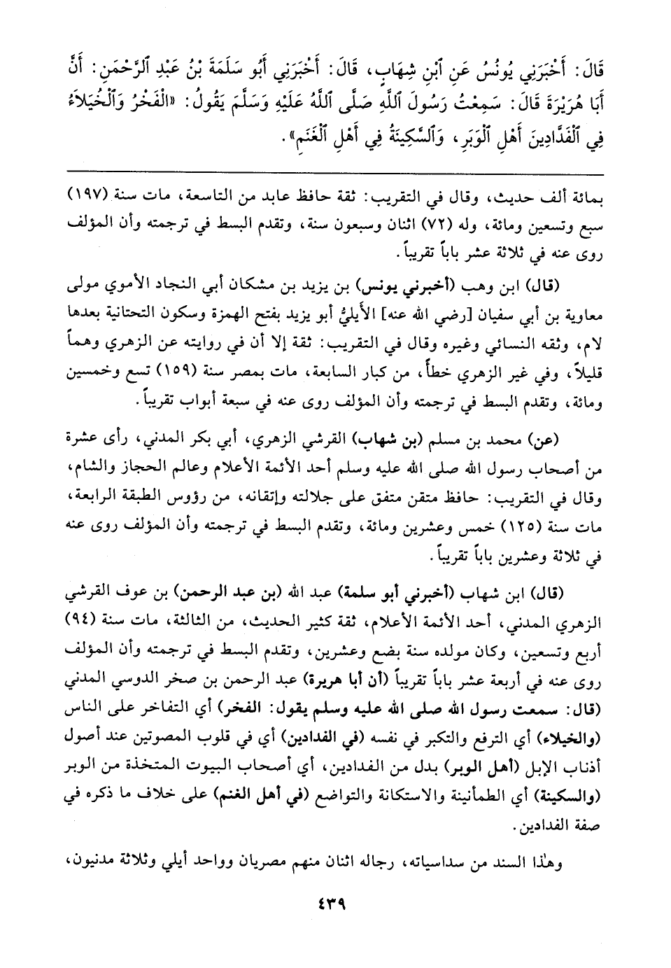 قَال: أَخْبَرَنِي يُونُسُ عَنِ ابْنِ شِهَابٍ، قَال: أَخْبَرَنِي أَبُو سَلَمَةَ بْنُ عَبْدِ الرَّحْمَنِ: أَنَّ أَبَا هُرَيرَةَ قَال: سَمِعْتُ رَسُولَ اللهِ صَلَّى اللهُ عَلَيهِ وَسَلَّمَ يَقُولُ: "الْفَخْرُ وَالْخُيَلاءُ فِي الْفَدَّادِينَ أَهْلِ الْوَبَرِ، وَالسَّكِينَةُ فِي أَهْلِ الْغَنَمِ"
