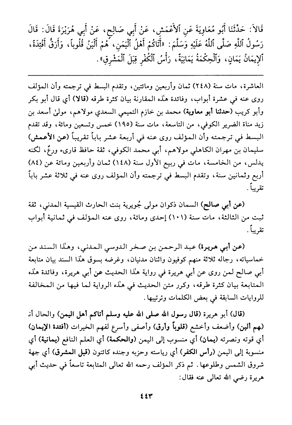 قَالا: حَدَّثَنَا أَبُو مُعَاويةَ عَنِ الأَعْمَشِ، عَنْ أَبِي صَالِحٍ، عَنْ أَبِي هُرَيرَةَ قَال: قَال رَسُولُ اللهِ صَلَّى اللهُ عَلَيهِ وَسَلَّمَ: "أَتَاكُمْ أَهْلُ الْيَمَنِ، هُمْ أَلْيَنُ قُلُوبًا، وَأَرَقُّ أَفْئِدَةً، الإِيمَانُ يَمَانٍ، وَالْحِكْمَةُ يَمَانِيَةٌ، رَأْسُ الْكُفْرِ قِبَلَ الْمَشْرِقِ"