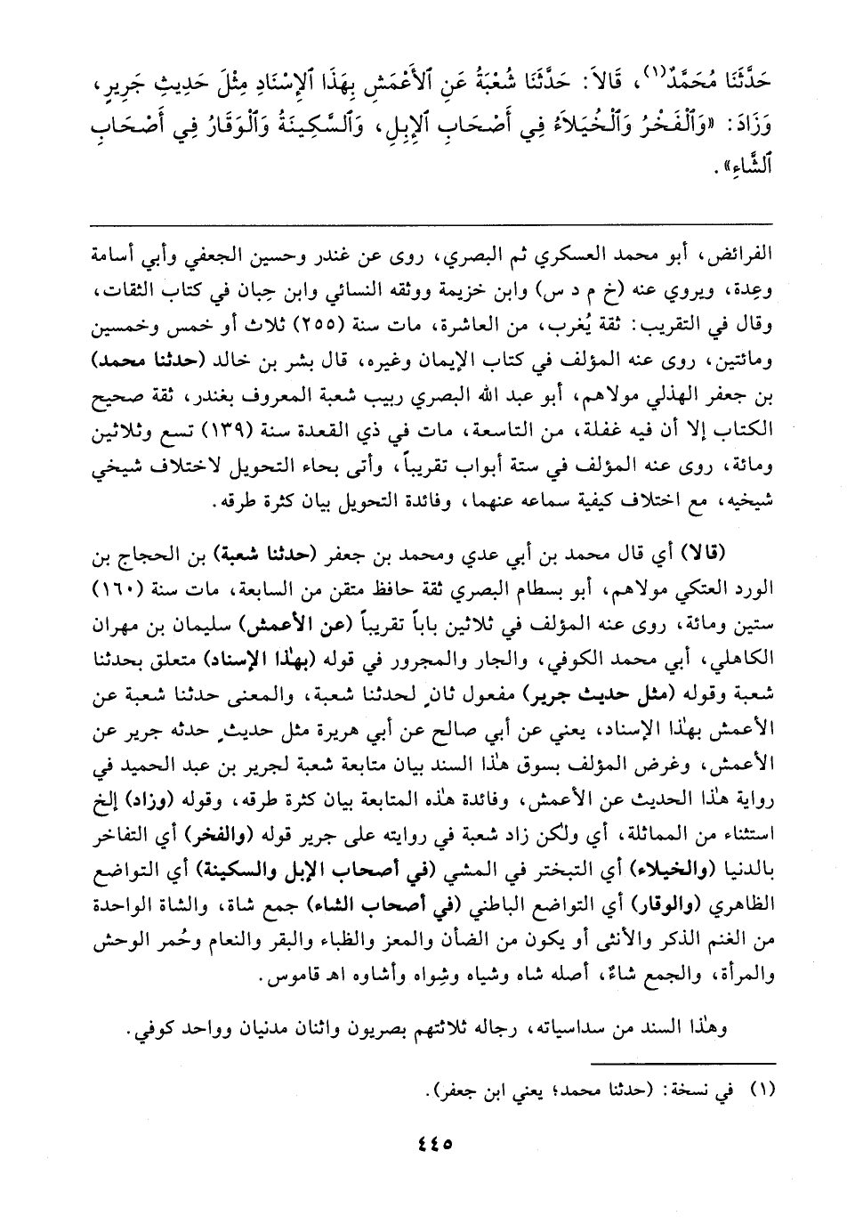 حَدَّثَنَا مُحَمَّدٌ (١)، قَالا: حَدَّثَنَا شُعْبَةُ عَنِ الأَعْمَشِ بِهَذَا الإِسْنَادِ مِثْلَ حَدِيثِ جَرِيرٍ، وَزَادَ: "وَالْفَخْرُ وَالْخُيَلَاءُ فِي أَصْحَابِ الإِبِلِ، وَالسَّكِينَةُ وَالْوَقَارُ فِي أَصْحَابِ الشَّاءِ"