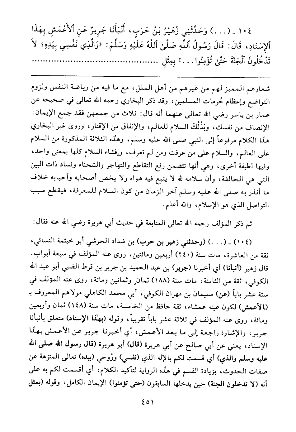 ثم ذكر المؤلف رحمه الله تعالى المتابعة في حديث أبي هريرة رضي الله عنه فقال: (١٠٤) - (٠٠) (وحدثني زهير بن حرب) بن شداد الحرشي أبو خيثمة النسائي، ثقة من العاشرة، مات سنة (٢٤٠) أربعين ومائتين، روى عنه المؤلف في سبعة أبواب. قال زهير (أنبأنا) أي أخبرنا (جرير) بن عبد الحميد بن جرير بن قرط الضبي أبو عبد الله الكوفي، ثقة من الثامنة، مات سنة (١٨٨) ثمانء وثمانين ومائة، روى عنه المؤلف في ستة عشر بابا (عن) سليمان بن مهران الكوفي، أبي محمد الكاهلي مولاهم المعروف بـ (الأعمش) لكون عينه عمشاء، ثقة حافظ من الخامسة، مات سنة (١٤٨) ثمان وأربعين ومائة، روى عنه المؤلف في ثلاثة عشر بابًا تقريبًا، وقوله (بهذا الإسناد) متعلق بأنبأنا جرير، والإشارة راجعة إلى ما بعد الأعمش، أي أخبرنا جرير عن الأعمش بهذا الإسناد، يعني عن أبي صالح عن أبي هريرة (قال) أبو هريرة (قال رسول الله صلى الله عليه وسلم والذي) أي قسمت لكم بالإله الذي (نفسي) ورُوحي (بيده) تعالى المنزهة عن صفات الحدوث، بزيادة القسم في هذه الرواية لتأكيد الكلام، أي أقسمت لكم به على أنه (لا تدخلون الجنة) حين يدخلها السابقون (حتى تؤمنوا) الإيمان الكامل، وقوله (بمثل