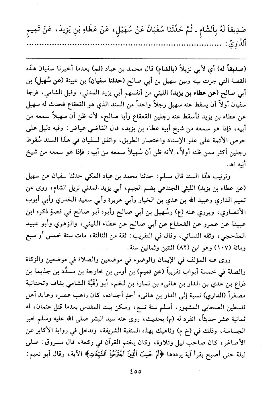 وترتيب هذا السند قال مسلم: حدثنا محمد بن عباد المكي حدثنا سفيان عن سهيل (عن عطاء بن يزيد) الليثي الجندعي بضم الجيم، أبي يزيد المدني نزيل الشام، روى عن تميم الداري وعبيد الله بن عدي بن الخيار وأبي هريرة وأبي سعيد الخدري وأبي أيوب الأنصاري، ويروي عنه (ع) وسهيل بن أبي صالح وأبوه أبو صالح في قصةٍ ذكره ابن عيينة عن عمرو عن القعقاع عن أبي صالح عن عطاء الليثي، والزهري وأبو عبيد المذحجي، وثقه النسائي، وقال في التقريب: ثقة من الثالثة، مات سنة خمس أو سبع ومائة (١٠٧) وهو ابن (٨٢) اثنتين وثمانين سنة.