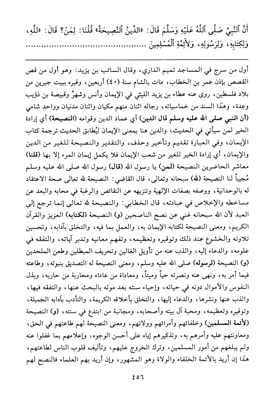 أَنَّ النَّبِيَّ صَلَّى اللهُ عَلَيهِ وَسَلَّمَ قَال: "الدِّينُ النصِيحَةُ" قُلْنَا: لِمَنْ؟ قَال: "للهِ، وَلِكِتَابِهِ، وَلِرَسُولِهِ، وَلأئَمَّةِ الْمُسْلِمِينَ