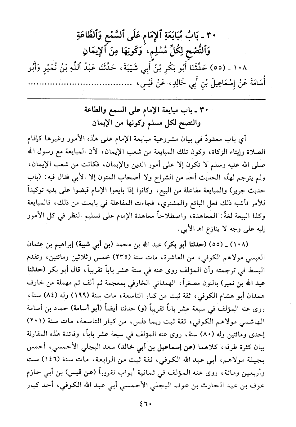 (١٠٨) - (٥٥) (حدثنا أبو بكر) عبد الله بن محمد (بن أبي شيبة) إبراهيم بن عثمان العبسي مولاهم الكوفي، من العاشرة، مات سنة (٢٣٥) خمس وثلاثين ومائتين، وتقدم البسط في ترجمته وأن المؤلف روى عنه في ستة عشر بابًا تقريبًا، قال أبو بكر (حدثنا عبد الله بن نمير) بالنون مصغرًا، الهمداني الخارفي بمعجمة ثم ألف ثم مهملة من خارف همدان أبو هشام الكوفي، ثقة ثبت من كبار التاسعة، مات سنة (١٩٩) وله (٨٤) سنة، روى عنه المؤلف في سبعة عشر بابًا تقريبًا (و) حدثنا أيضًا (أبو أسامة) حماد بن أسامة الهاشمي مولاهم الكوفي، ثقة ثبت ربما دلس، من كبار التاسعة، مات سنة (٢٠١) إحدى ومائتين وله (٨٠) سنة، روى عنه المؤلف في سبعة عشر بابا، وفائدة هذه المقارنة بيان كثرة طرقه، كلاهما (عن إسماعيل بن أبي خالد) سعد البجلي الأحمسي، أحمس بجيلة مولاهم، أبي عبد الله الكوفي، ثقة ثبت من الرابعة، مات سنة (١٤٦) ست وأربعين ومائة، روى عنه المؤلف في ثمانية أبواب تقريبًا (عن قيس) بن أبي حازم عوف بن عبد الحارث بن عوف البجلي الأحمسي أبي عبد الله الكوفي، أحد كبار