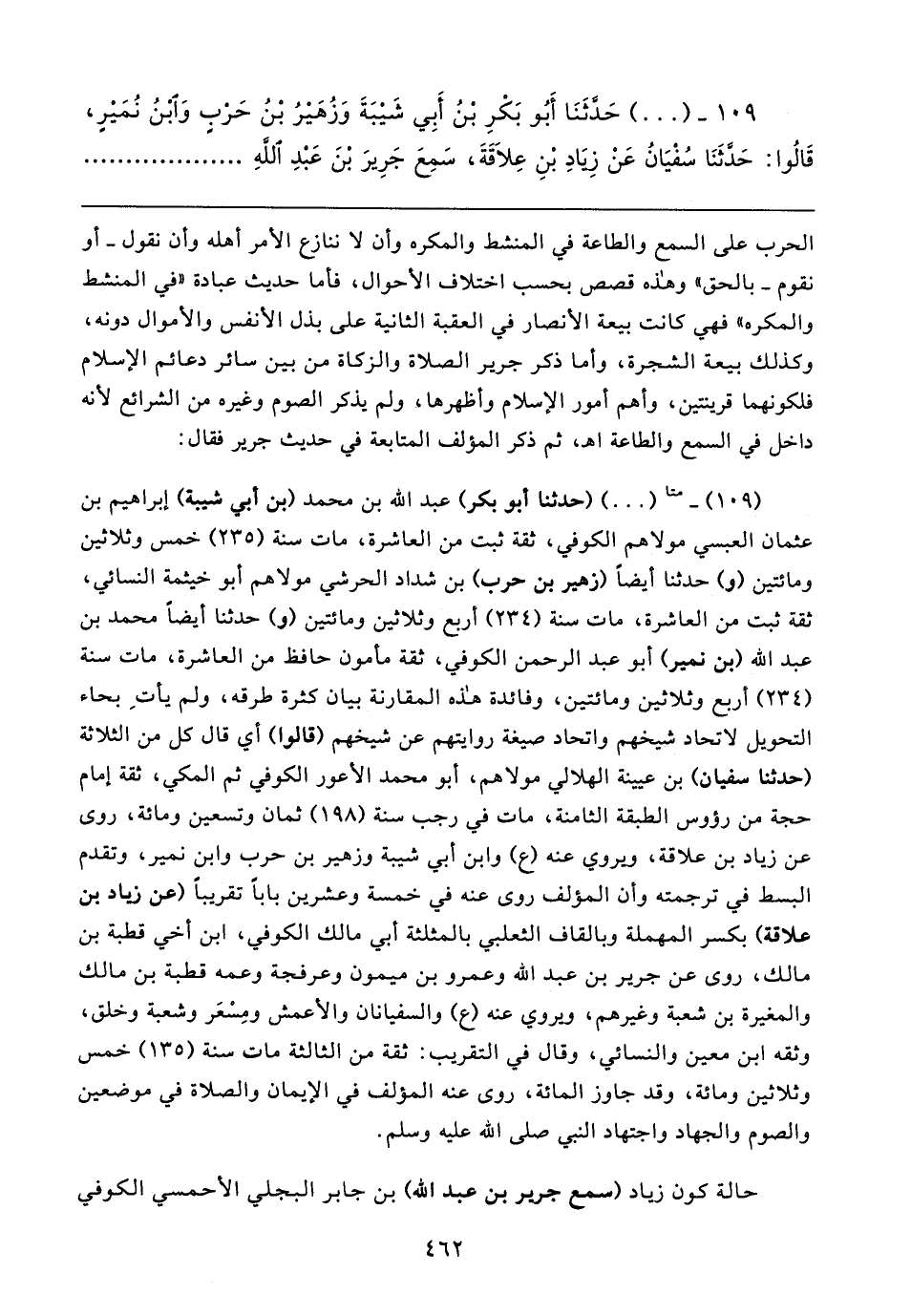 (١٠٩) - متا (٠٠) (حدثنا أبو بكر) عبد الله بن محمد (بن أبي شيبة) إبراهيم بن عثمان العبسي مولاهم الكوفي، ثقة ثبت من العاشرة، مات سنة (٢٣٥) خمس وثلاثين ومائتين (و) حدثنا أيضًا (زهير بن حرب) بن شداد الحرشي مولاهم أبو خيثمة النسائي، ثقة ثبت من العاشرة، مات سنة (٢٣٤) أربع وثلاثين ومائتين (و) حدثنا أيضًا محمد بن عبد الله (بن نمير) أبو عبد الرحمن الكوفي، ثقة مأمون حافظ من العاشرة، مات سنة (٢٣٤) أربع وثلاثين ومائتين، وفائدة هذه المقارنة بيان كثرة طرقه، ولم يأتِ بحاء التحويل لاتحاد شيخهم واتحاد صيغة روايتهم عن شيخهم (قالوا) أي قال كل من الثلاثة (حدثنا سفيان) بن عيينة الهلالي مولاهم، أبو محمد الأعور الكوفي ثم المكي، ثقة إمام حجة من رؤوس الطبقة الثامنة، مات في رجب سنة (١٩٨) ثمان وتسعين ومائة، روى عن زياد بن علاقة، ويروي عنه (ع) وابن أبي شيبة وزهير بن حرب وابن نمير، وتقدم البسط في ترجمته وأن المؤلف روى عنه في خمسة وعشرين بابًا تقريبًا (عن زياد بن علاقة) بكسر المهملة وبالقاف الثعلبي بالمثلثة أبي مالك الكوفي، ابن أخي قطبة بن مالك، روى عن جرير بن عبد الله وعمرو بن ميمون وعرفجة وعمه قطبة بن مالك والمغيرة بن شعبة وغيرهم، ويروي عنه (ع) والسفيانان والأعمش ومِسْعَر وشعبة وخلق، وثقه ابن معين والنسائي، وقال في التقريب: ثقة من الثالثة مات سنة (١٣٥) خمس وثلاثين ومائة، وقد جاوز المائة، روى عنه المؤلف في الإيمان والصلاة في موضعين والصوم والجهاد واجتهاد النبي صلى الله عليه وسلم.