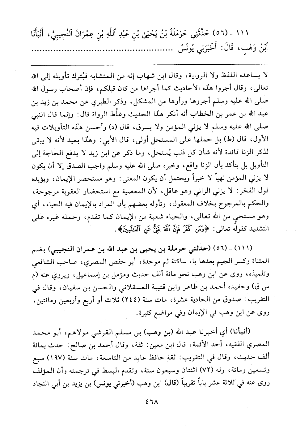 ١١١ - (٥٦) حَدَّثَنِي حَرْمَلَةُ بْنُ يَحْيَى بْنِ عَبْدِ اللهِ بْنِ عِمْرَانَ التُّجِيبِيُّ، أَنْبَأَنَا ابْنُ وَهْبٍ، قَال: أَخْبَرَنِي يُونُسُ