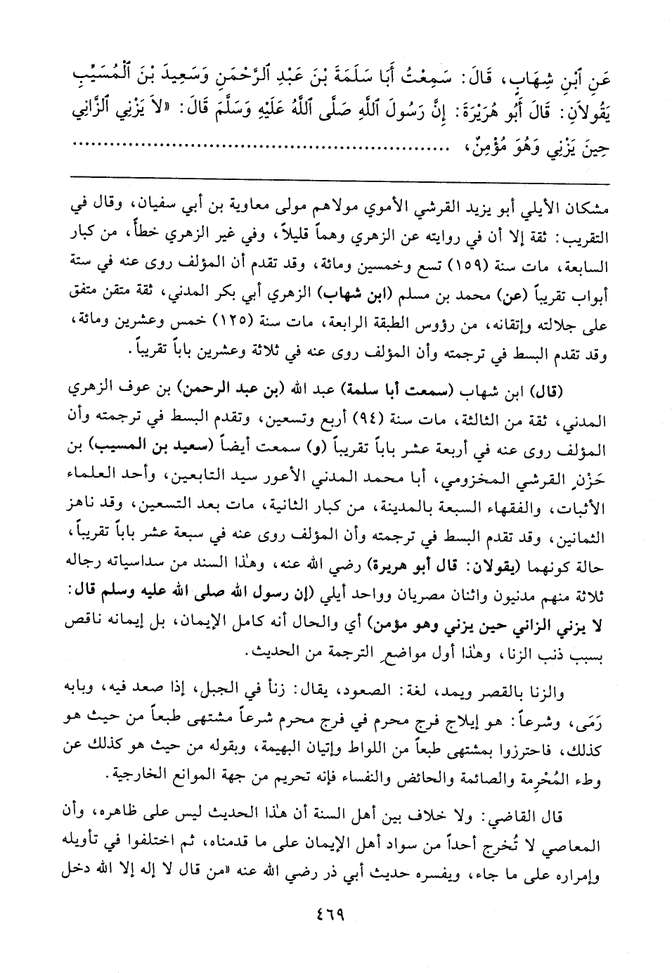 عَنِ ابْنِ شِهَابٍ، قَال: سَمِعْتُ أَبَا سَلَمَةَ بْنَ عَبْدِ الرَّحْمَنِ وَسَعِيدَ بْنَ الْمُسَيِّبِ يَقُولَانِ: قَال أَبُو هُرَيرَةَ: إِنَّ رَسُولَ اللهِ صَلَّى اللهُ عَلَيهِ وَسَلَّمَ قَال: "لَا يَزْنِي الزَّانِي حِينَ يَزْنِي وَهُوَ مُؤْمِنٌ،
