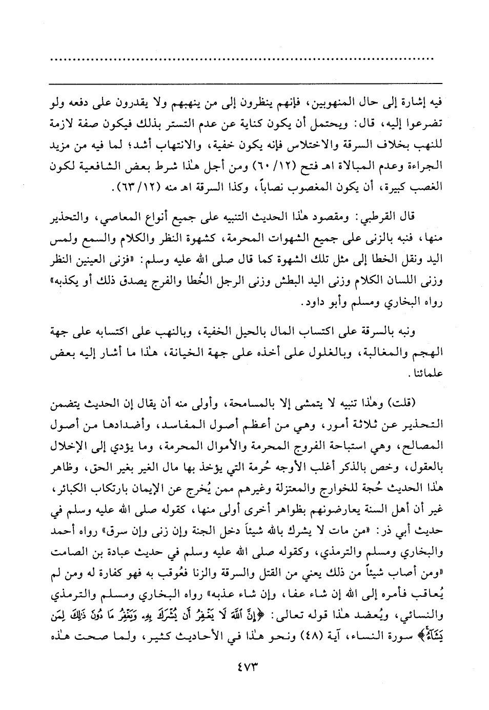 (قلت) وهذا تنبيه لا يتمشى إلا بالمسامحة، وأولى منه أن يقال إن الحديث يتضمن التحذير عن ثلاثة أمور، وهي من أعظم أصول المفاسد، وأضدادها من أصول المصالح، وهي استباحة الفروج المحرمة والأموال المحرمة، وما يؤدي إلى الإخلال بالعقول، وخص بالذكر أغلب الأوجه حُرمة التي يؤخذ بها مال الغير بغير الحق، وظاهر هذا الحديث حُجة للخوارج والمعتزلة وغيرهم ممن يُخرج عن الإيمان بارتكاب الكبائر، غير أن أهل السنة يعارضونهم بظواهر أخرى أولى منها، كقوله صلى الله عليه وسلم في حديث أبي ذر: "من مات لا يشرك بالله شيئًا دخل الجنة وإن زنى وإن سرق" رواه أحمد والبخاري ومسلم والترمذي، وكقوله صلى الله عليه وسلم في حديث عبادة بن الصامت "ومن أصاب شيئًا من ذلك يعني من القتل والسرقة والزنا فعُوقب به فهو كفارة له ومن لم يُعاقب فأمره إلى الله إن شاء عفا، وإن شاء عذبه" رواه البخاري ومسلم والترمذي والنسائي، ويُعضد هذا قوله تعالى: {إِنَّ اللَّهَ لَا يَغْفِرُ أَنْ يُشْرَكَ بِهِ وَيَغْفِرُ مَا دُونَ ذَلِكَ لِمَنْ يَشَاءُ} [النساء: ٤٨]، ونحو هذا في الأحاديث كثير، ولما صحت هذه