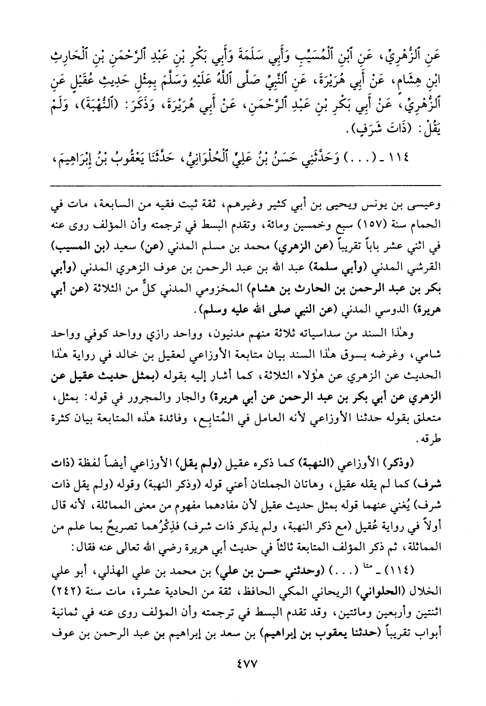 (١١٤) - متا (٠٠) و (حدثني حسن بن علي) بن محمد بن علي الهذلي، أبو علي الخلال (الحلواني) الريحاني المكي الحافظ، ثقة من الحادية عشرة، مات سنة (٢٤٢) اثنتين وأربعين ومائتين، وقد تقدم البسط في ترجمته وأن المؤلف روى عنه في ثمانية أبواب تقريبًا (حدثنا يعقوب بن إبراهيم) بن سعد بن إبراهيم بن عبد الرحمن بن عوف