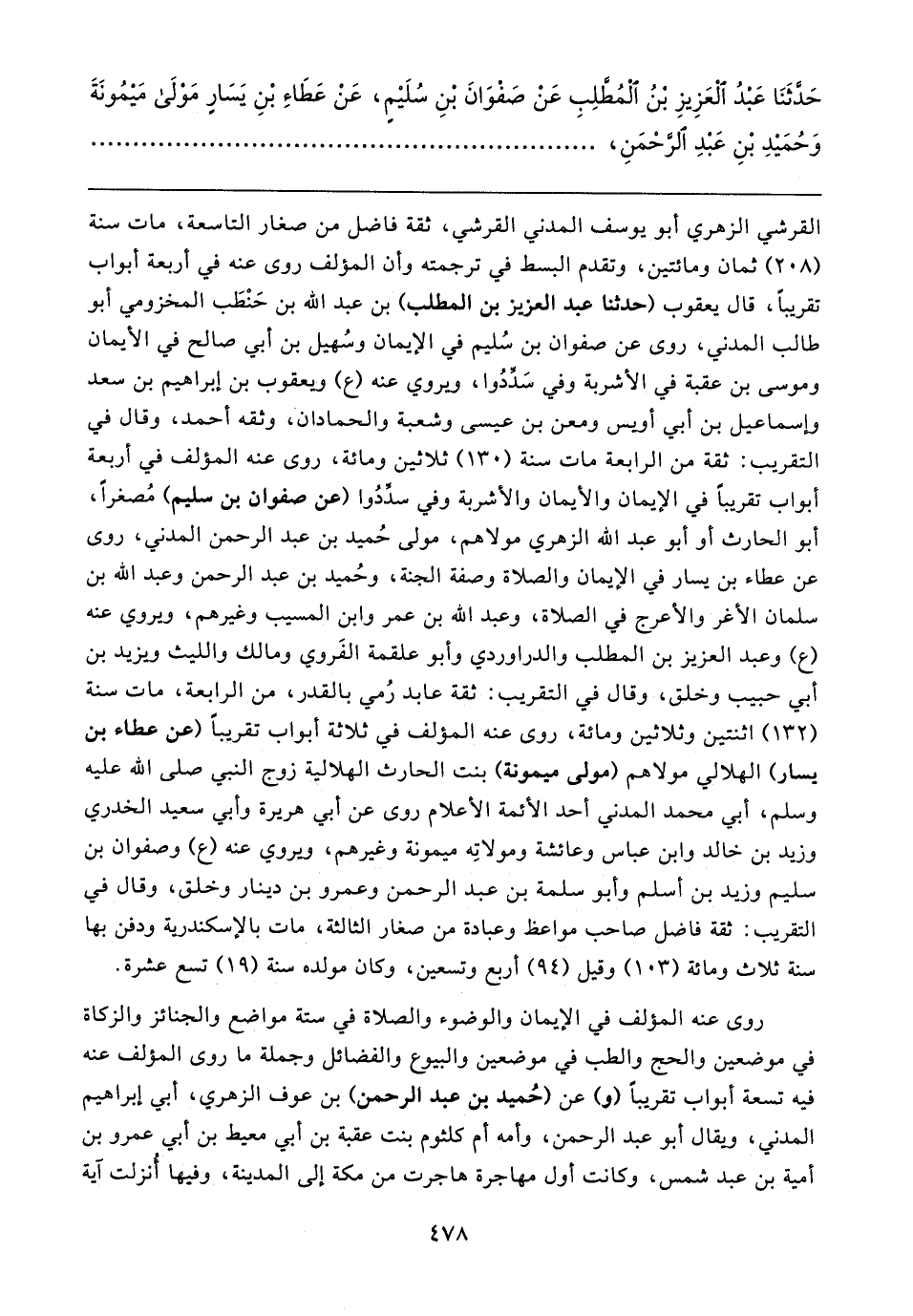 القرشي الزهري أبو يوسف المدني القرشي، ثقة فاضل من صغار التاسعة، مات سنة (٢٠٨) ثمان ومائتين، وتقدم البسط في ترجمته وأن المؤلف روى عنه في أربعة أبواب تقريبًا، قال يعقوب (حدثنا عبد العزيز بن المطلب) بن عبد الله بن حَنْطَب المخزومي أبو طالب المدني، روى عن صفوان بن سُليم في الإيمان وسُهيل بن أبي صالح في الأيمان وموسى بن عقبة في الأشربة وفي سَدِّدُوا، ويروي عنه (ع) ويعقوب بن إبراهيم بن سعد وإسماعيل بن أبي أويس ومعن بن عيسى وشعبة والحمادان، وثقه أحمد، وقال في التقريب: ثقة من الرابعة مات سنة (١٣٠) ثلاثين ومائة، روى عنه المؤلف في أربعة أبواب تقريبًا في الإيمان والأيمان والأشربة وفي سدِّدُوا (عن صفوان بن سليم) مُصغرًا، أبو الحارث أو أبو عبد الله الزهري مولاهم، مولى حُميد بن عبد الرحمن المدني، روى عن عطاء بن يسار في الإيمان والصلاة وصفة الجنة، وحُميد بن عبد الرحمن وعبد الله بن سلمان الأغر والأعرج في الصلاة، وعبد الله بن عمر وابن المسيب وغيرهم، ويروي عنه (ع) وعبد العزيز بن المطلب والدراوردي وأبو علقمة الفَروي ومالك والليث ويزيد بن أبي حبيب وخلق، وقال في التقريب: ثقة عابد رُمي بالقدر، من الرابعة، مات سنة (١٣٢) اثنتين وثلاثين ومائة، روى عنه المؤلف في ثلاثة أبواب تقريبًا (عن عطاء بن يسار) الهلالي مولاهم (مولى ميمونة) بنت الحارث الهلالية زوج النبي صلى الله عليه وسلم، أبي محمد المدني أحد الأئمة الأعلام روى عن أبي هريرة وأبي سعيد الخدري وزيد بن خالد وابن عباس وعائشة ومولاتِه ميمونة وغيرهم، ويروي عنه (ع) وصفوان بن سليم وزيد بن أسلم وأبو سلمة بن عبد الرحمن وعمرو بن دينار وخلق، وقال في التقريب: ثقة فاضل صاحب مواعظ وعبادة من صغار الثالثة، مات بالإسكندرية ودفن بها سنة ثلاث ومائة (١٠٣) وقيل (٩٤) أربع وتسعين، وكان مولده سنة (١٩) تسع عشرة.