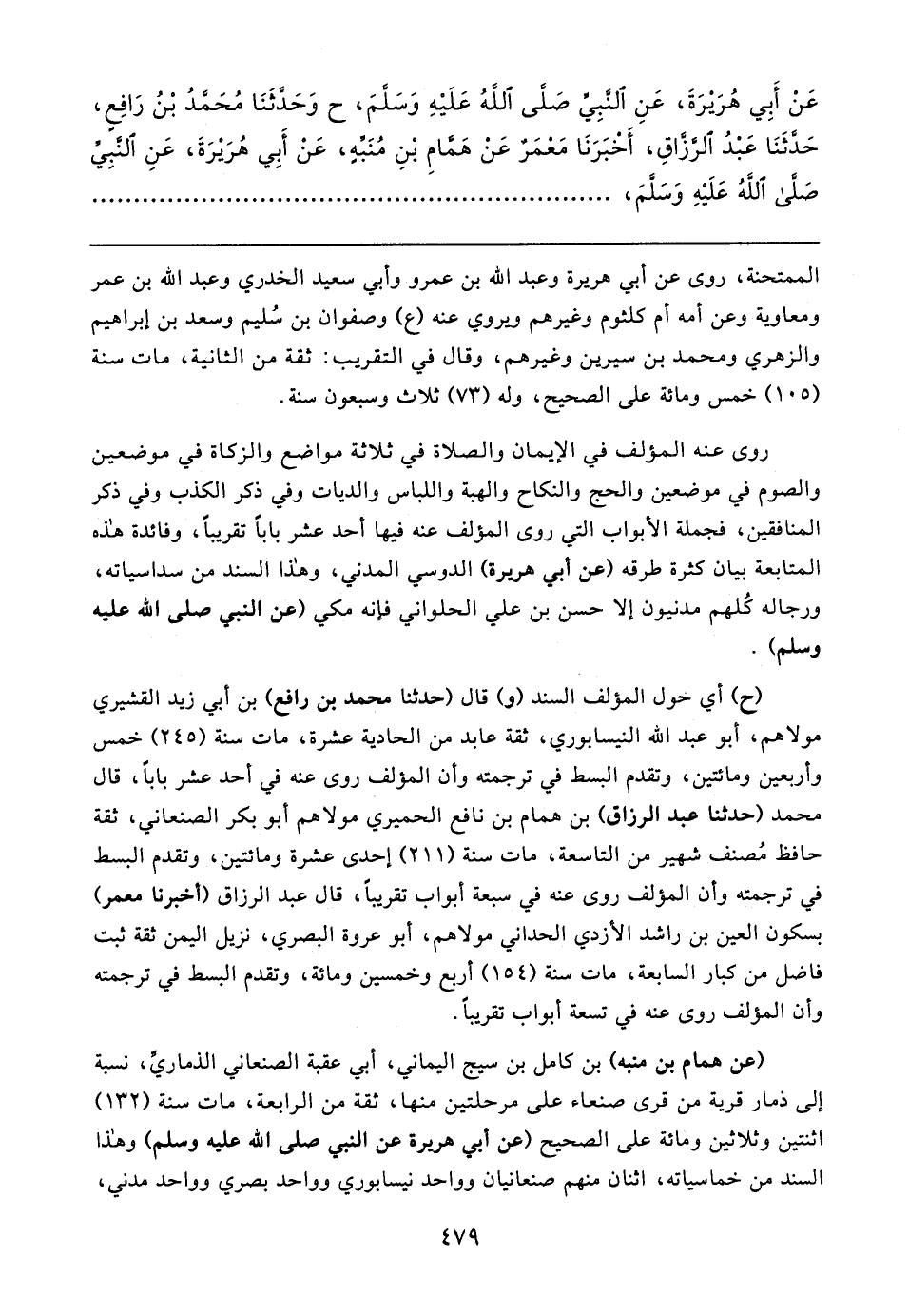 (عن همام بن منبه) بن كامل بن سريج اليماني، أبي عقبة الصنعاني الذماريِّ، نسبة إلى ذمار قرية من قرى صنعاء على مرحلتين منها، ثقة من الرابعة، مات سنة (١٣٢) اثنتين وثلاثين ومائة على الصحيح (عن أبي هريرة عن النبي صلى الله عليه وسلم) وهذا السند من خماسياته، اثنان منهم صنعانيان وواحد نيسابوري وواحد بصري وواحد مدني،