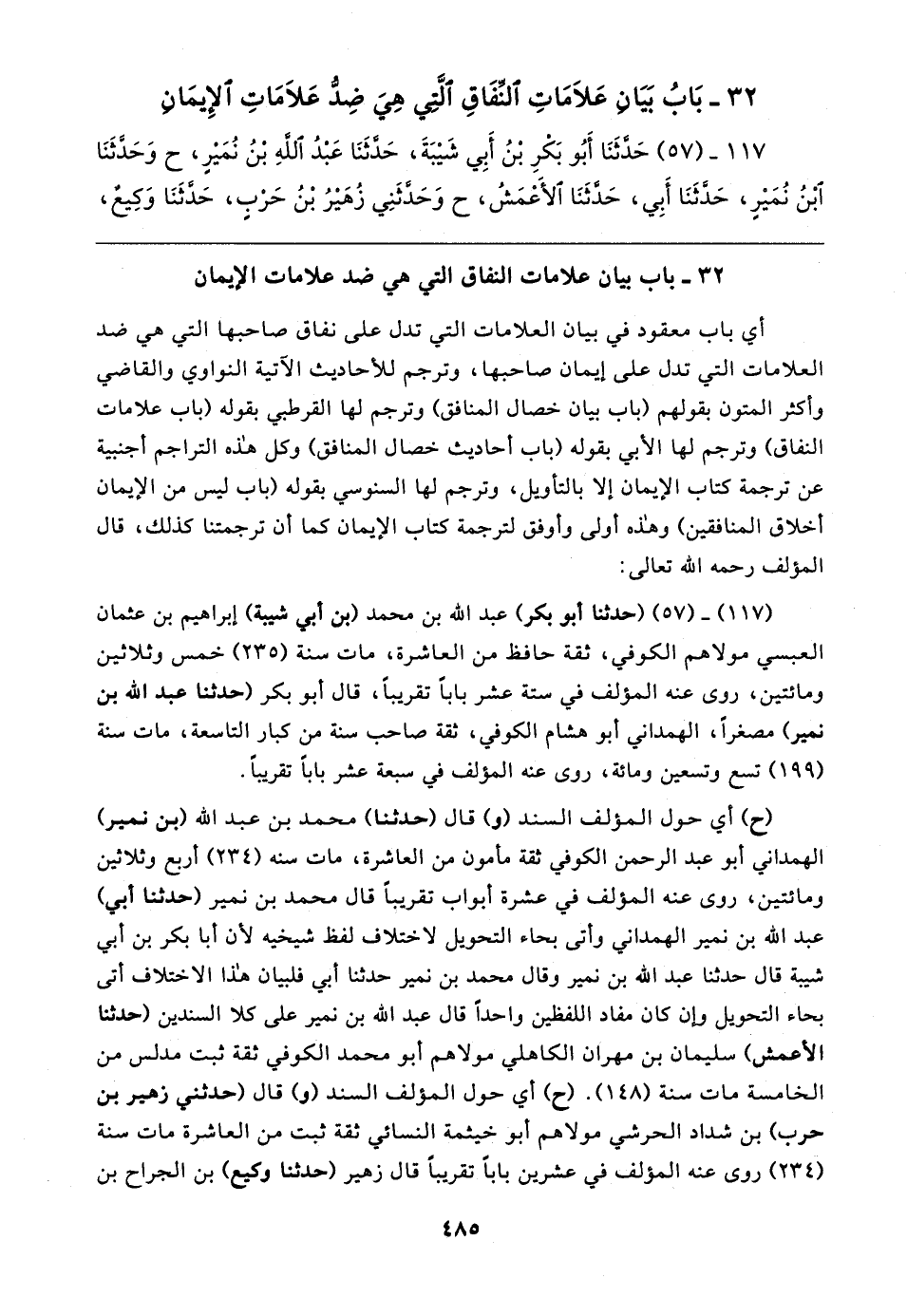 (١١٧) - (٥٧) (حدثنا أبو بكر) عبد الله بن محمد (بن أبي شيبة) إبراهيم بن عثمان العبسي مولاهم الكوفي، ثقة حافظ من العاشرة، مات سنة (٢٣٥) خمس وثلاثين ومائتين، روى عنه المؤلف في ستة عشر بابًا تقريبًا، قال أبو بكر (حدثنا عبد الله بن نمير) مصغرًا، الهمداني أبو هشام الكوفي، ثقة صاحب سنة من كبار التاسعة، مات سنة (١٩٩) تسع وتسعين ومائة، روى عنه المؤلف في سبعة عشر بابًا تقريبًا.