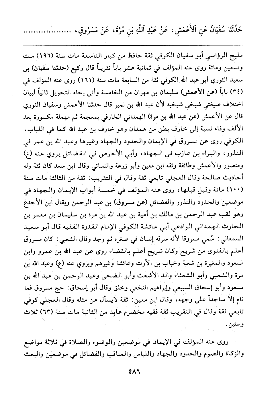 مليح الرؤاسي أبو سفيان الكوفي ثقة حافظ من كبار التاسعة مات سنة (١٩٦) ست وتسعين ومائة روى عنه المؤلف في ثمانية عشر بابًا تقريبًا قال وكيع (حدثنا سفيان) بن سعيد الثوري أبو عبد الله الكوفي ثقة من السابعة مات سنة (١٦١) روى عنه المؤلف في (٣٤) بابًا (عن الأعمش) سليمان بن مهران من الخامسة وأتى بحاء التحويل ثانيًا لبيان اختلاف صيغتي شيخي شيخيه لأن عبد الله بن نمير قال حدثنا الأعمش وسفيان الثوري قال عن الأعمش (عن عبد الله بن مرة) الهمداني الخارفي بمعجمة ثم مهملة مكسورة بعد الألف وفاء نسبة إلى خارف بطن من همدان وهو خارف بن عبد الله كما في اللباب، الكوفي روى عن مسروق في الإيمان والحدود والجهاد وغيرها وعبد الله بن عمر في النذور، والبراء بن عازب في الجهاد، وأبي الأحوص في الفضائل يروي عنه (ع) ومنصور والأعمش وطائفة وثقه ابن معين وأبو زرعة والنسائي وقال ابن سعد كان ثقة وله أحاديث صالحة وقال العجلي تابعي ثقة وقال في التقريب: ثقة من الثالثة مات سنة (١٠٠) مائة وقيل قبلها، روى عنه المؤلف في خمسة أبواب الإيمان والجهاد في موضعين والحدود والنذور والفضائل (عن مسروق) بن عبد الرحمن ويقال ابن الأجدع وهو لقب عبد الرحمن بن مالك بن أمية بن عبد الله بن مرة بن سليمان بن معمر بن الحارث الهمداني الوادعي أبي عائشة الكوفي الإمام القدوة الفقيه قال أبو سعيد السمعاني: سُمي مسروقا لأنه سرقه إنسان في صغره ثم وجد وقال الشعبي: كان مسروق أعلم بالفتوى من شريح وكان شريح أعلم بالقضاء روى عن عبد الله بن عمرو وابن مسعود والمغيرة بن شعبة وخباب بن الأرت وعائشة وغيرهم ويروي عنه (ع) وعبد الله بن مرة والشعبي وأبو الشعثاء والد الأشعث وأبو الضحى وعبد الرحمن بن عبد الله بن مسعود وأبو إسحاق السبيعي وإبراهيم النخعي وخلق وقال أبو إسحاق: حج مسروق فما نام إلا ساجدًا على وجهه، وقال ابن معين: ثقة لا يسأل عن مثله وقال العجلي كوفي تابعي ثقة وقال في التقريب ثقة فقيه مخضرم عابد من الثانية مات سنة (٦٣) ثلاث وستين.