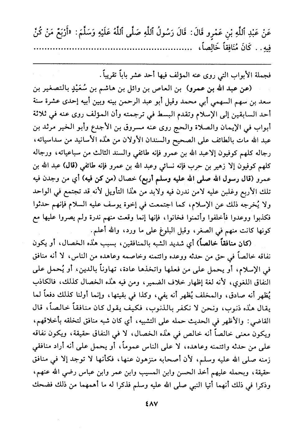 عَنْ عَبْدِ اللهِ بْنِ عَمْرٍو قَال: قَال رَسُولُ اللهِ صَلَّى اللهُ عَلَيهِ وَسَلَّمَ: "أَرْبَعٌ مَنْ كُنَّ فِيهِ .. كَانَ مُنَافِقًا خَالِصًا،