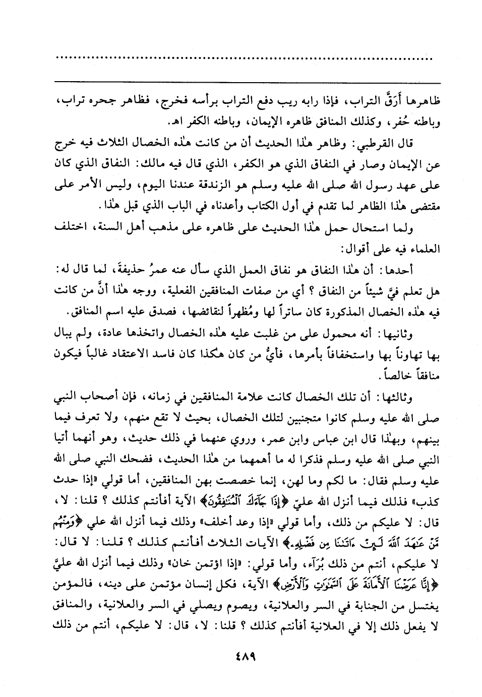 قال القرطبي: وظاهر هذا الحديث أن من كانت هذه الخصال الثلاث فيه خرج عن الإيمان وصار في النفاق الذي هو الكفر، الذي قال فيه مالك: النفاق الذي كان على عهد رسول الله صلى الله عليه وسلم هو الزندقة عندنا اليوم، وليس الأمر على مقتضى هذا الظاهر لما تقدم في أول الكتاب وأعدناه في الباب الذي قبل هذا.