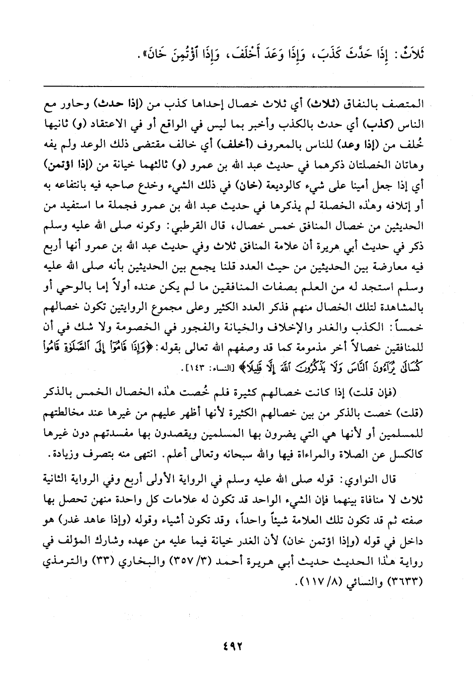 قال النواوي: قوله صلى الله عليه وسلم في الرواية الأولى أربع وفي الرواية الثانية ثلاث لا منافاة بينهما فإن الشيء الواحد قد تكون له علامات كل واحدة منهن تحصل بها صفته ثم قد تكون تلك العلامة شيئًا واحدًا، وقد تكون أشياء وقوله (وإذا عاهد غدر) هو داخل في قوله (وإذا اؤتمن خان) لأن الغدر خيانة فيما عليه من عهده وشارك المؤلف في رواية هذا الحديث حديث أبي هريرة أحمد (٣/ ٣٥٧) والبخاري (٣٣) والترمذي (٣٦٣٣) والنسائي (٨/ ١١٧).