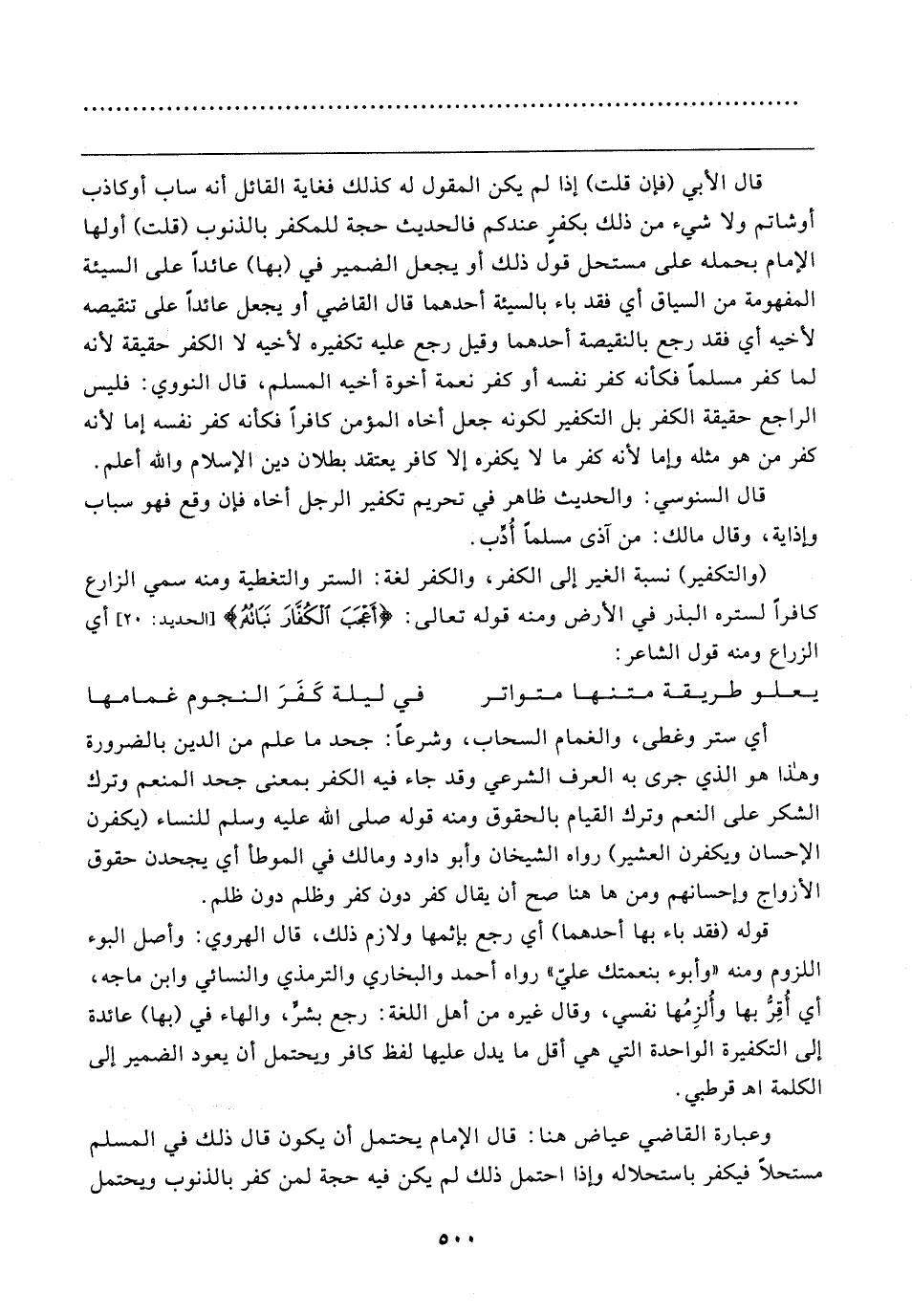 وعبارة القاضي عياض هنا قال الإِمام يحتمل أن يكون قال ذلك في المسلم مستحلًا فيكفر باستحلاله وإذا احتمل ذلك لم يكن فيه حجة لمن كفر بالذنوب ويحتمل
