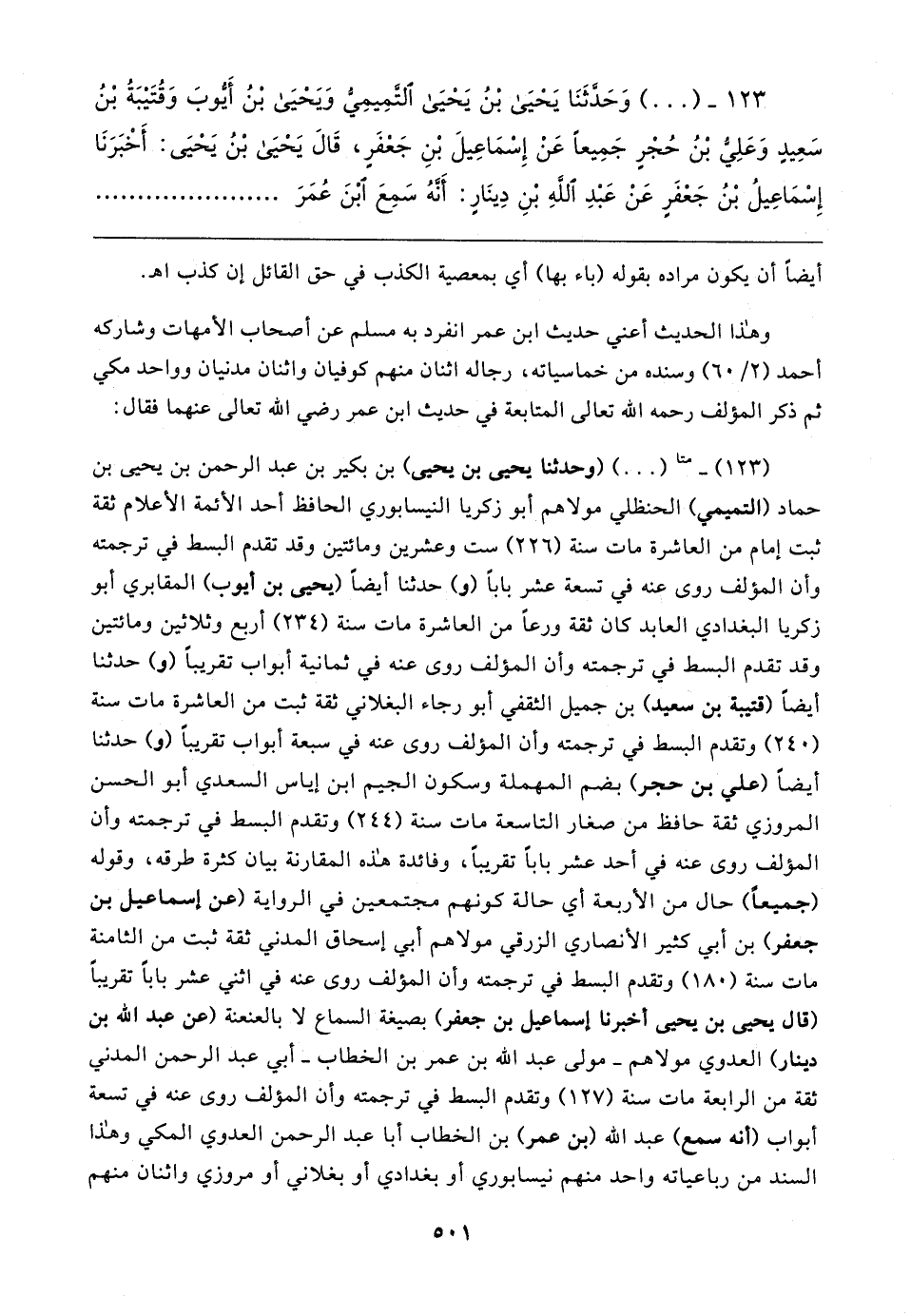 ١٢٣ - (٠٠) وَحَدَّثَنَا يَحْيَى بْنُ يَحْيَى التَّمِيمِيُّ وَيَحْيَى بنُ أيوبَ وَقُتَيبَةُ بْنُ سعيد وَعَلِي بْنُ حُجْرٍ جَمِيعًا عَنْ إِسْمَاعِيلَ بْنِ جَعْفَرٍ، قَال يَحْيَى بْنُ يَحْيَى: أَخْبَرَنَا إِسْمَاعِيلُ بْنُ جَعْفَرٍ عَنْ عَبْدِ الله بْنِ دِينَارٍ: أَنهُ سَمِعَ ابْنَ عُمَرَ