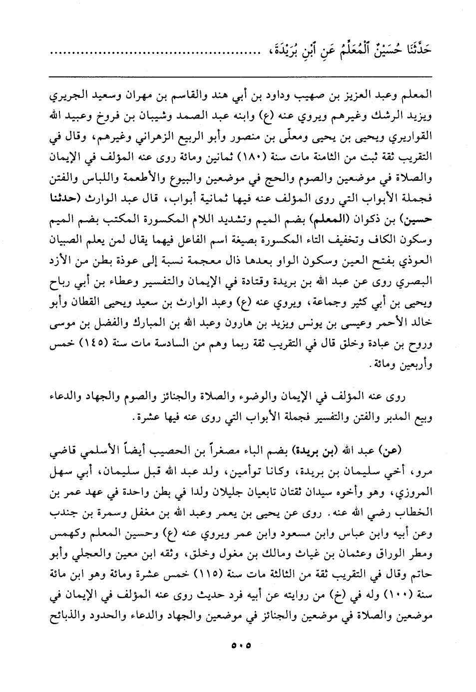 المعلم وعبد العزيز بن صهيب وداود بن أبي هند والقاسم بن مهران وسعيد الجريري ويزيد الرشك وغيرهم ويروي عنه (ع) وابنه عبد الصمد وشيبان بن فروخ وعبيد الله القواريري ويحيى بن يحيى ومعلّى بن منصور وأبو الرَّبيع الزهراني وغيرهم، وقال في التقريب ثِقَة ثبت من الثامنة مات سنة (١٨٠) ثمانين ومائة روى عنه المؤلف في الإيمان والصلاة في موضعين والصوم والحج في موضعين والبيوع والأطعمة واللباس والفتن فجملة الأبواب التي روى المؤلف عنه فيها ثمانية أبواب، قال عبد الوارث (حَدَّثَنَا حسين) بن ذكران (المعلم) بضم الميم وتشديد اللام المكسورة المكتب بضم الميم وسكون الكاف وتخفيف التاء المكسورة بصيغة اسم الفاعل فيهما يقال لمن يعلم الصبيان العوذي بفتح العين وسكون الواو بعدها ذال معجمة نسبة إلى عوذة بطن من الأزد البَصْرِيّ روى عن عبد الله بن بريدة وقتادة في الإيمان والتفسير وعطاء بن أبي رباح ويحيى بن أبي كثير وجماعة، ويروي عنه (ع) وعبد الوارث بن سعيد ويحيى القطَّان وأبو خالد الأحمر وعيسى بن يونس ويزيد بن هارون وعبد الله بن المبارك والفضل بن موسى وروح بن عبادة وخلق قال في التقريب ثِقَة ربما وهم من السادسة مات سنة (١٤٥) خمس وأربعين ومائة.
