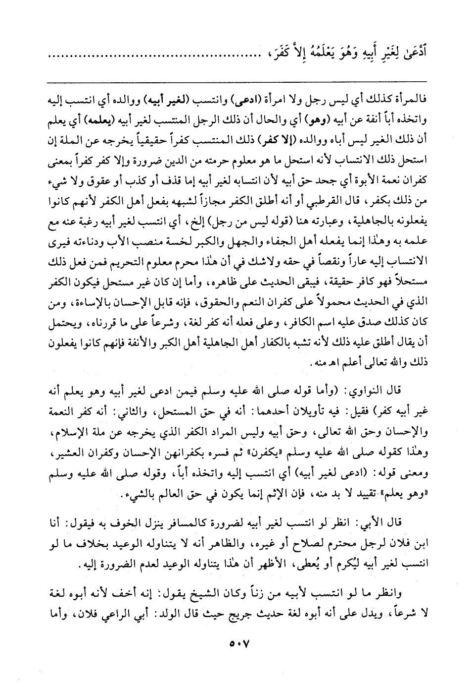قال النواوي: (وأما قوله صلى الله عليه وسلم فيمن ادعى لغير أَبيه وهو يعلم أنَّه غير أَبيه كفر) فقيل: فيه تأويلان أحدهما: أنَّه في حق المستحل، والثاني: أنَّه كفر النعمة والإحسان وحق الله تعالى، وحق أَبيه وليس المراد الكفر الذي يخرجه عن ملة الإِسلام، وهذا كقوله صلى الله عليه وسلم "يكفرن" ثم فسره بكفرانهن الإحسان وكفران العشير، ومعنى قوله: (ادعى لغير أَبيه) أي انتسب إليه واتخذه أبًا، وقوله صلى الله عليه وسلم "وهو يعلم" تقييد لا بد منه، فإن الإثم إنما يكون في حق العالم بالشيء.