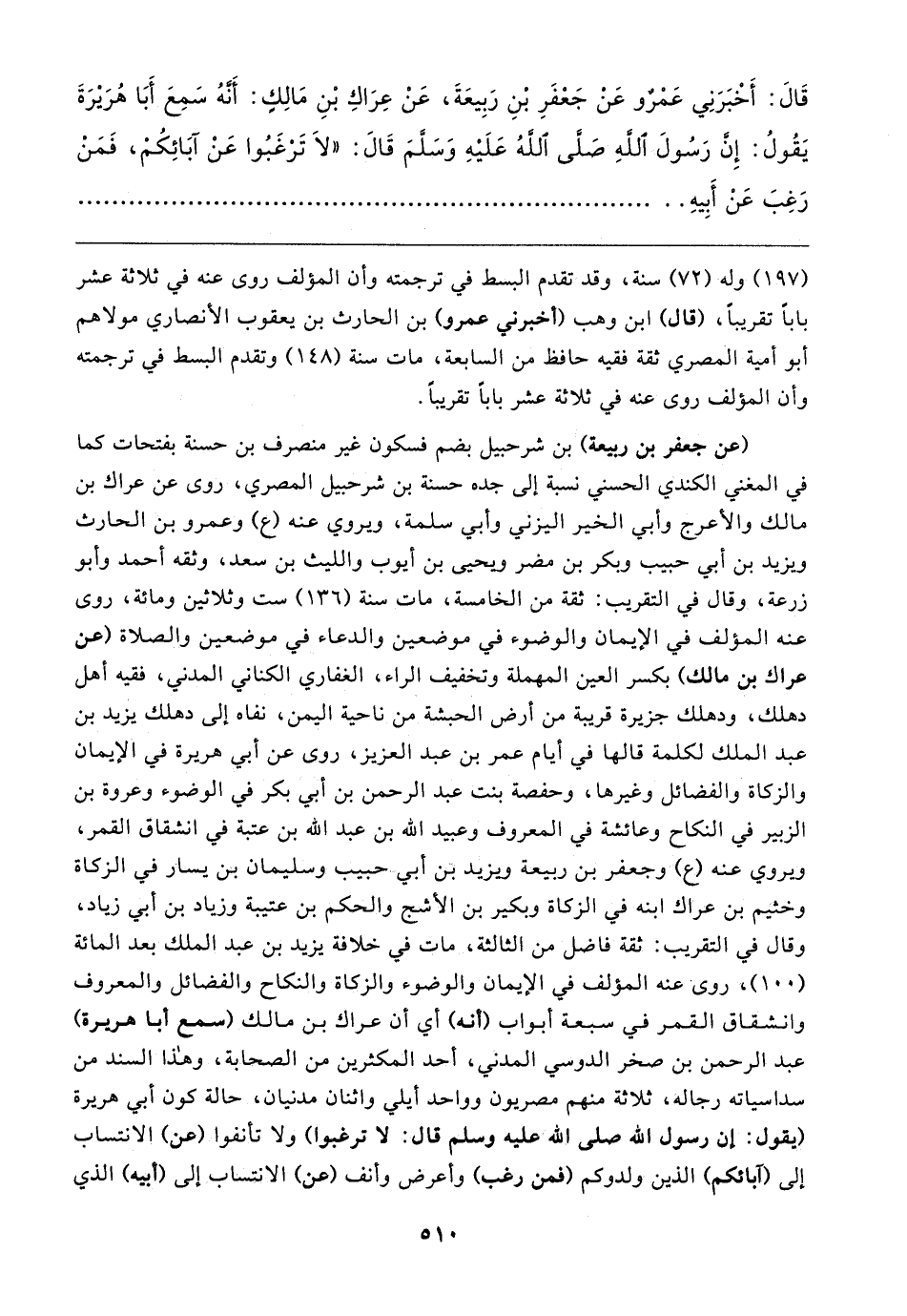 قَال: أَخْبَرَنِي عَمْروٌ عَنْ جَعْفَرِ بْنِ رَبِيعَةَ، عَنْ عِرَاكِ بْنِ مَالِكٍ: أَنَّهُ سَمِعَ أَبَا هُرَيرَةَ يَقُولُ: إِن رَسُولَ الله صَلى الله عَلَيهِ وَسلمَ قَال: "لا تَرْغَبُوا عَنْ آبَائِكُمْ، فَمَنْ رَغِبَ عَنْ أبِيهِ