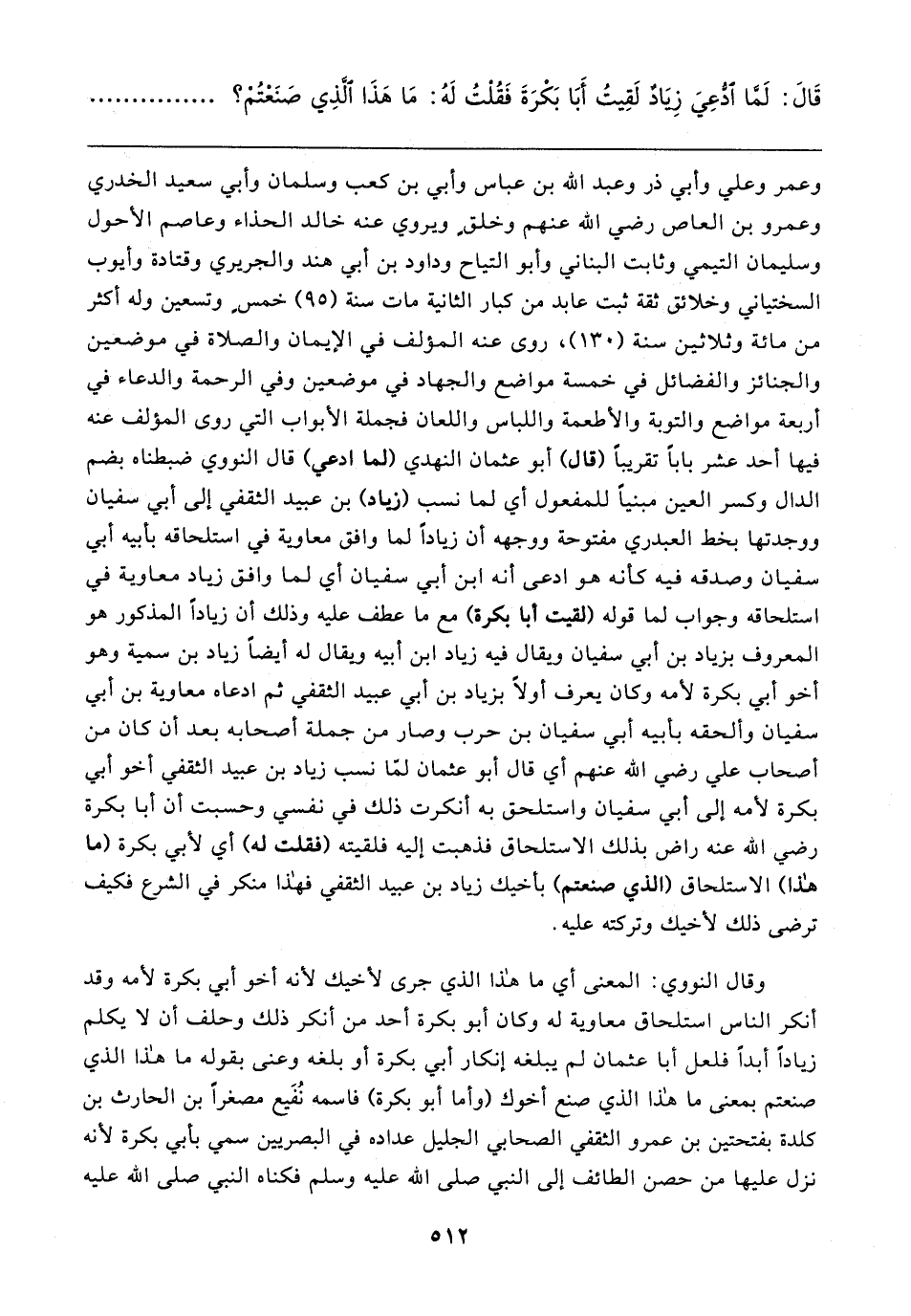 وعمر وعلي وأبي ذر وعبد الله بن عباس وأبي بن كعب وسلمان وأبي سعيد الخُدرِيّ وعمرو بن العاص رضي الله عنهم وخلقٍ ويروي عنه خالد الحذَّاء وعاصم الأحول وسليمان التَّيميّ وثابت البناني وأبو التَّيَّاح وداود بن أبي هند والجريري وقتادة وأيوب السختياني وخلائق ثِقَة ثبت عابد من كبار الثَّانية مات سنة (٩٥) خمسٍ وتسعين وله أكثر من مائة وثلاثين سنة (١٣٠)، روى عنه المؤلف في الإيمان والصلاة في موضعين والجنائز والفضائل في خمسة مواضع والجهاد في موضعين وفي الرحمة والدعاء في أربعة مواضع والتوبة والأطعمة واللباس واللعان فجملة الأبواب التي روى المؤلف عنه فيها أحد عشر بابًا تقريبًا (قال) أبو عثمان النهدي (لما ادعي) قال النووي ضبطناه بضم الدال وكسر العين مبنيًّا للمفعول أي لما نسب (زياد) بن عبيد الثَّقَفيّ إلى أبي سفيان ووجدتها بخط العبدري مفتوحة ووجهه أن زيادًا لما وافق معاوية في استلحاقه بأبيه أبي سفيان وصدقه فيه كأنه هو ادعى أنَّه ابن أبي سفيان أي لما وافق زياد معاوية في استلحاقه وجواب لما قوله (لقيت أَبا بكرة) مع ما عطف عليه وذلك أن زيادًا المذكور هو المعروف بزياد بن أبي سفيان ويقال فيه زياد ابن أَبيه ويقال له أَيضًا زياد بن سمية وهو أخو أبي بكرة لأمه وكان يعرف أولًا بزياد بن أبي عبيد الثَّقَفيّ ثم ادعاه معاوية بن أبي سفيان وألحقه بأبيه أبي سفيان بن حرب وصار من جملة أصحابه بعد أن كان من أصحاب علي رضي الله عنهم أي قال أبو عثمان لمّا نسب زياد بن عبيد الثَّقَفيّ أخو أبي بكرة لأمه إلى أبي سفيان واستلحق به أنكرت ذلك في نفسي وحسبت أن أَبا بكرة رضي الله عنه راض بذلك الاستلحاق فذهبت إليه فلقيته (فقك له) أي لأبي بكرة (ما هذا) الاستلحاق (الذي صنعتم) بأخيك زياد بن عبيد الثَّقَفيّ فهذا منكر في الشرع فكيف ترضى ذلك لأخيك وتركته عليه.