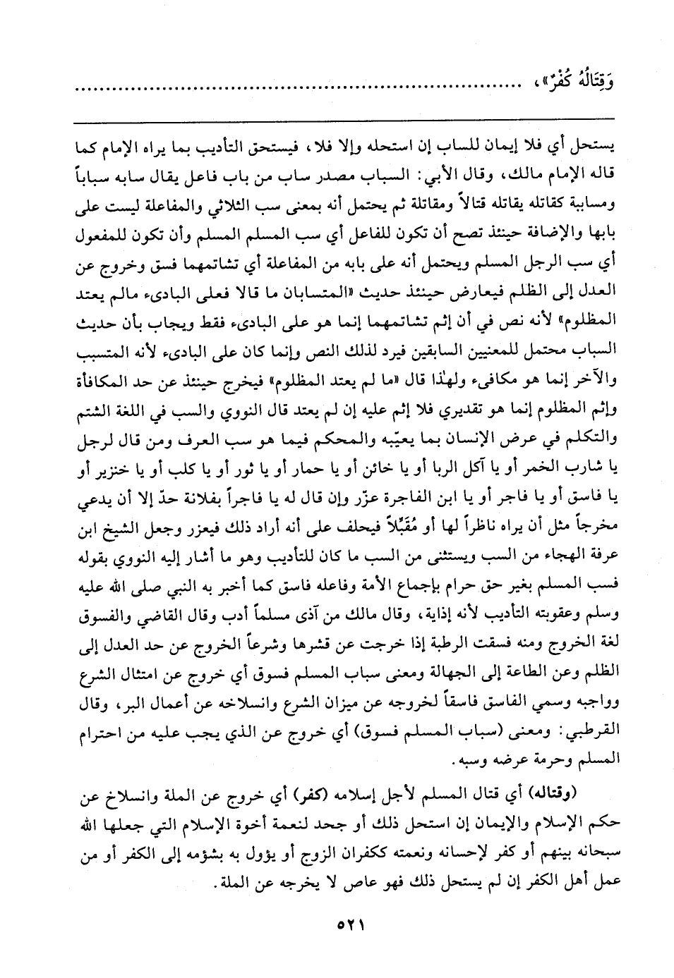 (وقتاله) أي قتال المسلم لأجل إسلامه (كفر) أي خروج عن الملة وانسلاخ عن حكم الإِسلام والإيمان إن استحل ذلك أو جحد لنعمة أخوة الإِسلام التي جعلها الله سبحانه بينهم أو كفر لإحسانه ونعمته كفران الزوج أو يؤول به بشؤمه إلى الكفر أو من عمل أهل الكفر إن لم يستحل ذلك فهو عاص لا يخرجه عن الملة.
