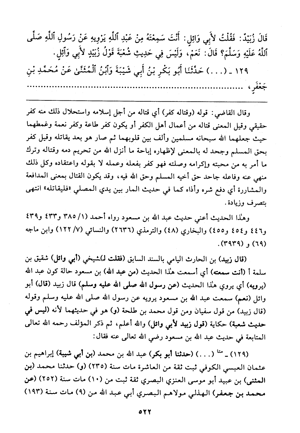 قَال زُبَيدٌ: فَقُلْتُ لأَبِي وَائِلٍ: أَنتَ سَمِعْتَهُ من عَبْدِ الله يَرويهِ عَنْ رَسُولِ اللهِ صلى الله عَلَيهِ وَسَلمَ؟ قَال: نَعَم، وَلَيسَ في حَدِيثِ شُعْبَةَ قَوْلُ زُبَيدٍ لأَبِي وَائِلٍ.