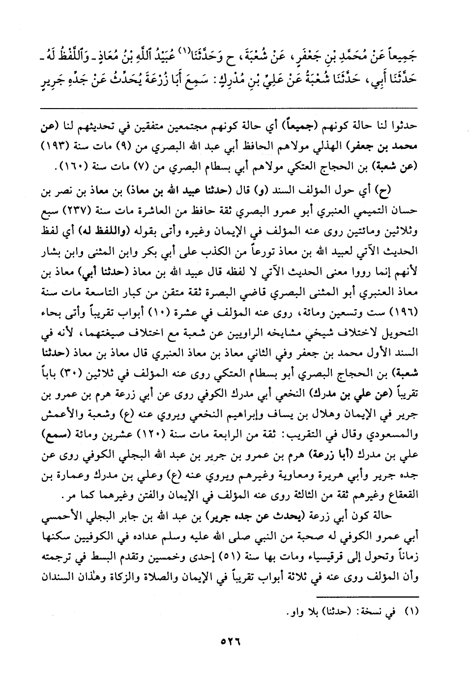 جَمِيعًا عَنْ مُحَمَّد بْنِ جَعْفَرٍ، عَنْ شُعْبَةَ، ح وَحَدْثَنَا (١) عُبَيدُ الله بن مُعَاذِ -وَاللَّفْظُ لَهُ- حَدَّثَنَا أَبِي، حَدَّثَنَا شُعْبَةُ عَنْ عَلِيِّ بْنِ مُدرِكٍ: سَمِعَ أَبَا زُرْعَةَ يُحَدِّثُ عَنْ جدهِ جَرِيرٍ